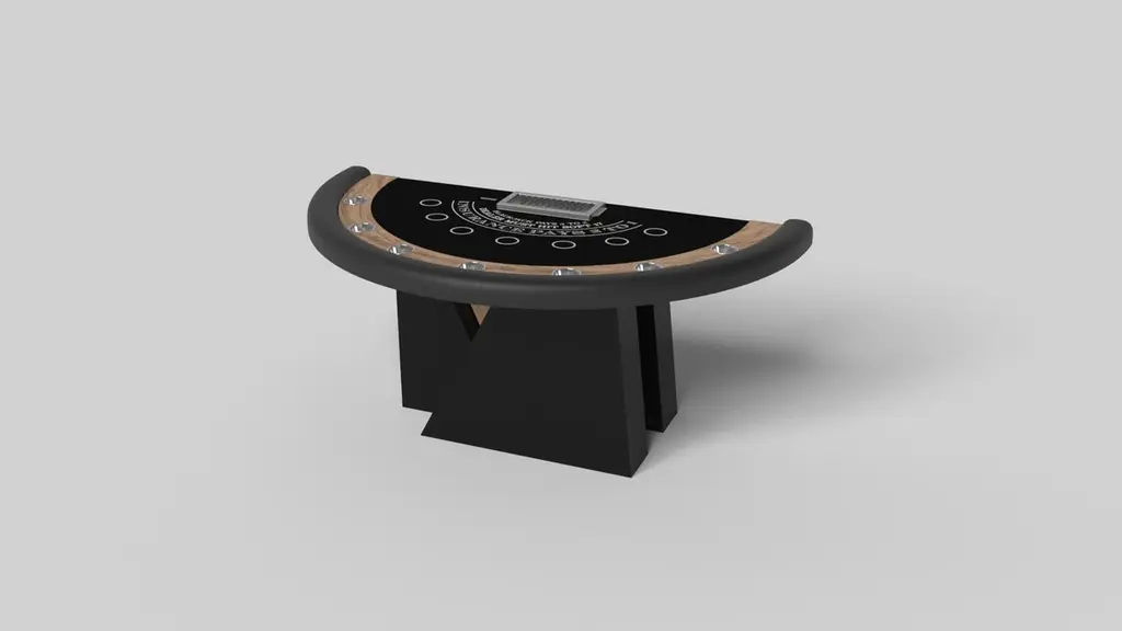 An asymmetric base creates a free-floating silhouette, making the Stilt blackjack table in walnut a compelling, contemporary addition to the modern home. Detailed with a chip rack and betting circles, this luxury handcrafted game table boasts an exclusive, thought provoking design with an angled, offset base that seems to defy the laws of gravity and logic.Size:88”X46”X30” (Dining Height)Custom Sizes Available Per Request