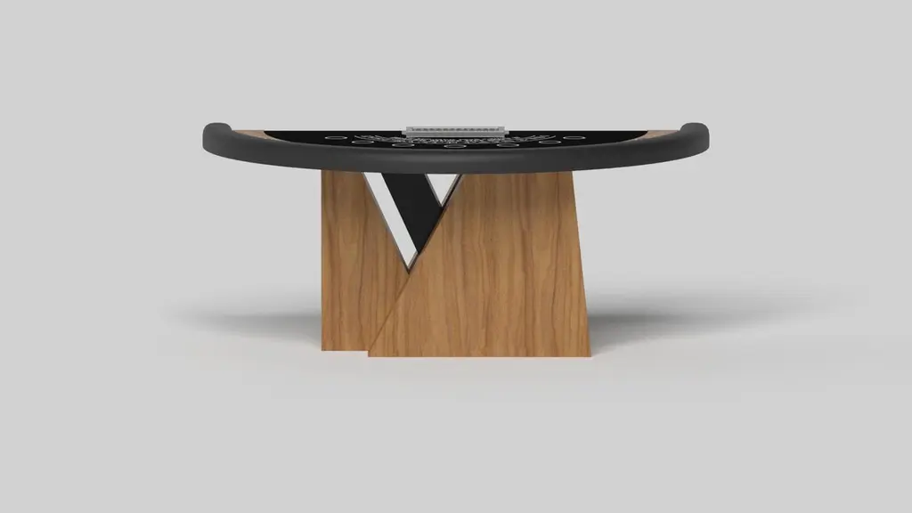 An asymmetric base creates a free-floating silhouette, making the Stilt blackjack table in walnut a compelling, contemporary addition to the modern home. Detailed with a chip rack and betting circles, this luxury handcrafted game table boasts an exclusive, thought provoking design with an angled, offset base that seems to defy the laws of gravity and logic.Size:88”X46”X30” (Dining Height)Custom Sizes Available Per Request