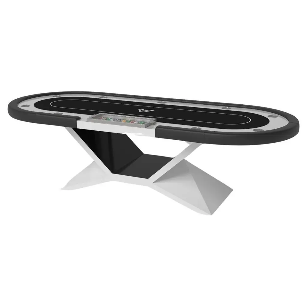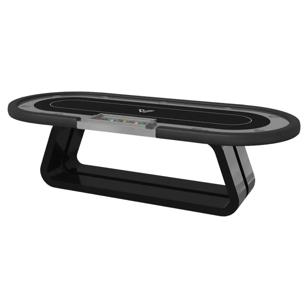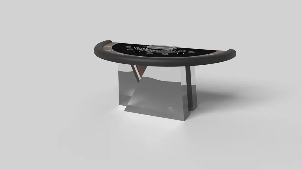 An asymmetric base creates a free-floating silhouette, making the Stilt blackjack table in walnut a compelling, contemporary addition to the modern home. Detailed with a chip rack and betting circles, this luxury handcrafted game table boasts an exclusive, thought provoking design with an angled, offset base that seems to defy the laws of gravity and logic.Size:88”X46”X30” (Dining Height)Custom Sizes Available Per Request
