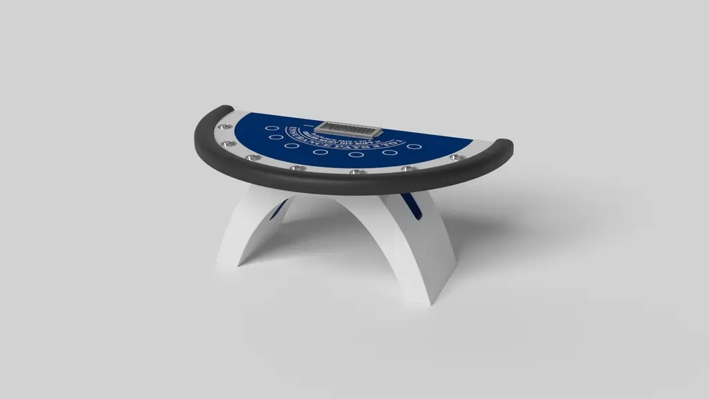 An open, arched base balances beautifully against the hard edges of the semicircular surface top, making the Zenith blackjack table in white a striking juxtaposition of modern, geometric forms. Minimalist in its appeal yet luxurious in design, this contemporary table is handcrafted with a professional tabletop and distinctive details that embody an open-minded, open-ended sense of spirit.Size:88”X46”X30” (Dining Height)Custom Sizes Available Per Request