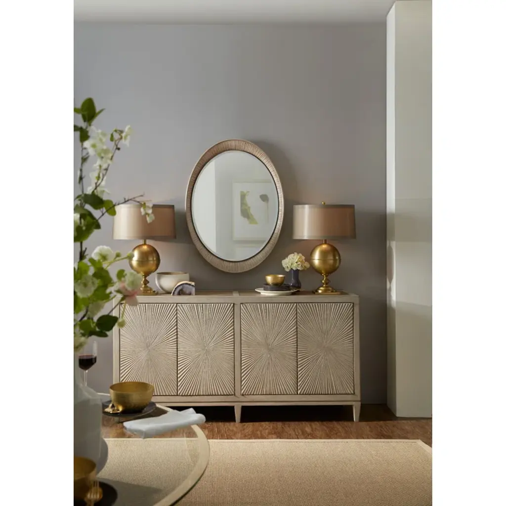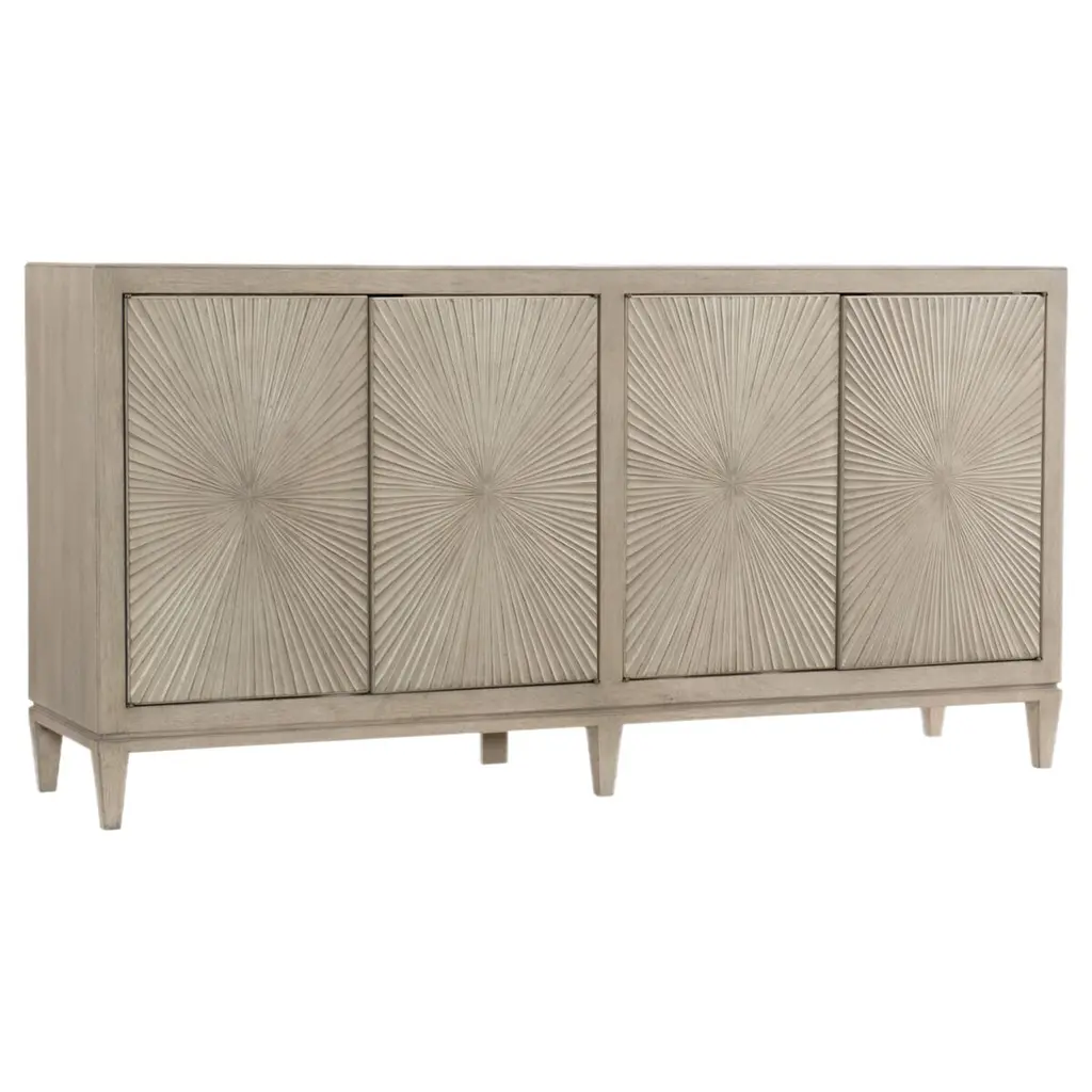 With the stunning textured starburst pattern on the doors, you will want to show off the elixir buffet throughout your home. Use it in the hall as an entry piece, in the dining room as a buffet, or use this tv-ready piece in the family room as an entertainment center or console. The 4 doors have touch latches, and there are 2 drawers and 2 adjustable shelves behind each set of doors. Ventilated back panel. Accommodates up to 70-inch flat-screen tv. Elixir is a casual contemporary collection that, as its name implies, exudes a feeling of comfort, simplicity, and well-being. While elixir has crisp, clean lines, character and visual interest are also achieved through the use of texture. Textural interest comes from the use of lightly sand-blasted walnut veneer, the light texture applied to the metal elements along with a hand-carved texture added to the surface of select pieces such as the oval mirror and the round dining table. The buffet offers a beautiful carved starburst pattern on the doors.