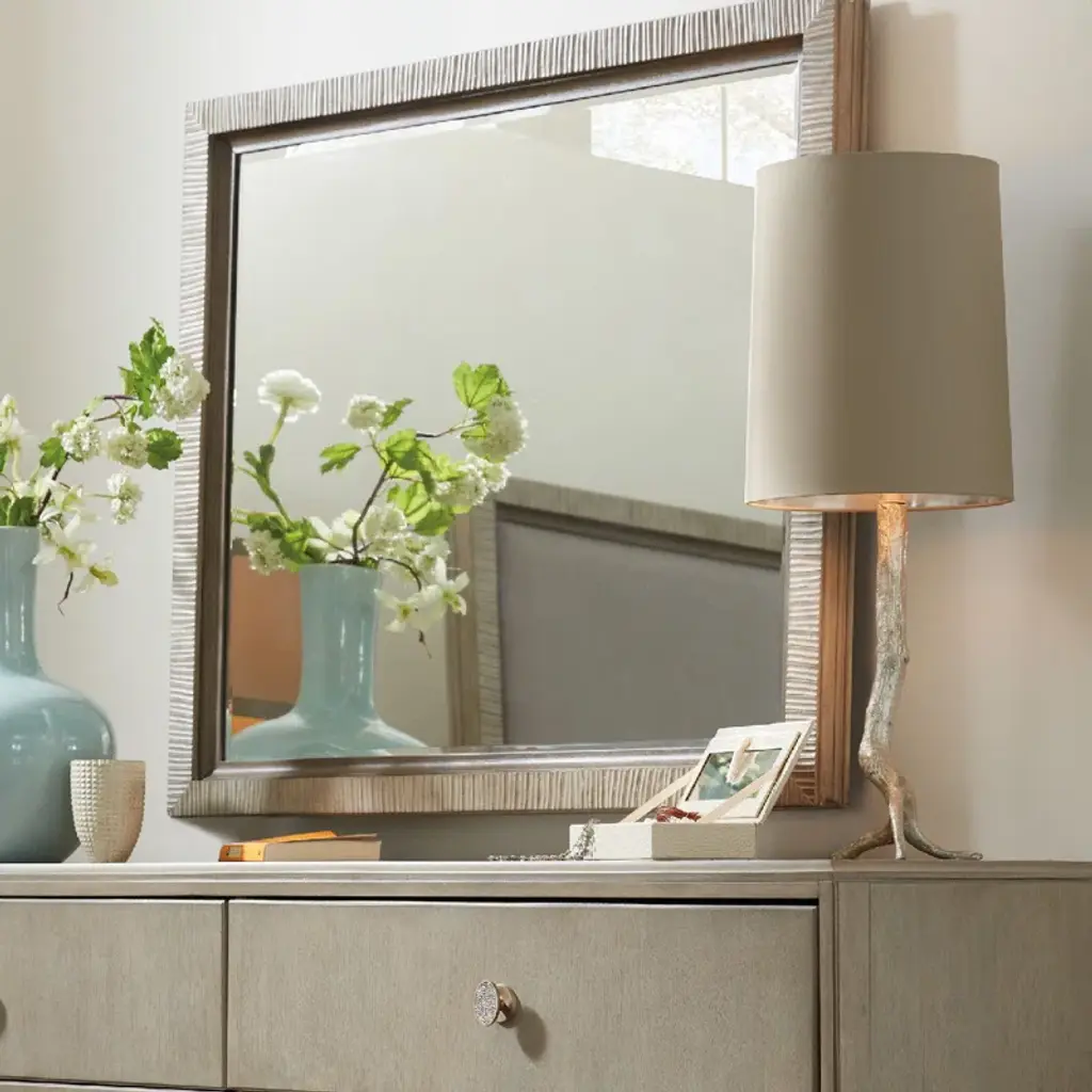 Crisp. Clean. Simple. Top your dresser, console, or buffet with the soft modern Elixir Mirror to add style and character. Finished in a serene grey beige finish applied to lightly sand-blasted walnut veneer for an organic and textured look. Elixir is a casual contemporary collection that, as its name implies, exudes a feeling of comfort, simplicity, and well-being. While Elixir has crisp, clean lines, character and visual interest are also achieved through the use of texture. Textural interest comes from the use of lightly sand-blasted walnut veneer, the light texture applied to the metal elements with a hand-carved texture added to the surface of select pieces such as the oval mirror and the round dining table. The buffet offers a beautiful carved starburst pattern on the doors.
