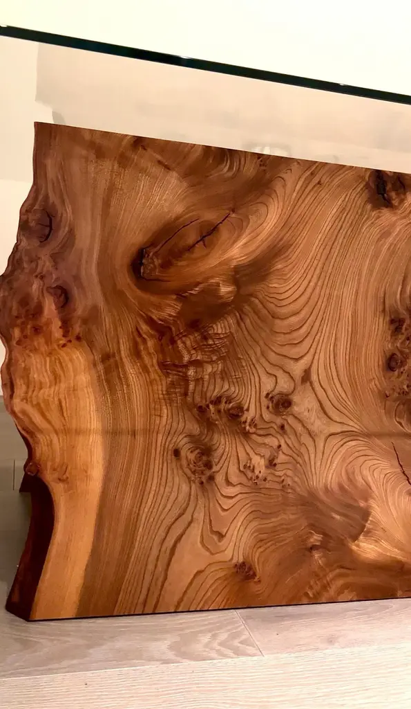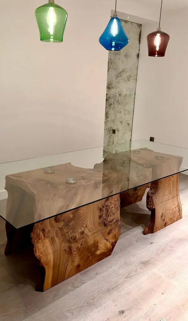 Using a very special variation of Elm wood (burr Elm), each of the two table bases start life as one single large board. They are then cut into three pieces at 45 degree angles and joined back together to create the waterfall effect in which the grain lines up and falls from one edge to the other.Glass is then made to specification and steel discs are bonded onto the glass for fixing before raising the glass just above the Elm bases and giving the impression of levitation, serving as the surface area for the table.This table can also be made in any wood type or finish, and can be made to any dimension / measurement.Every item is made-to-order so is quality checked profusely prior to crating and shipping, therefore returns are only accepted under the circumstances something has gone seriously wrong and the material used by ourselves has somehow failed. Out of the sale price, we pay for professional crating and this has been successful every single time.