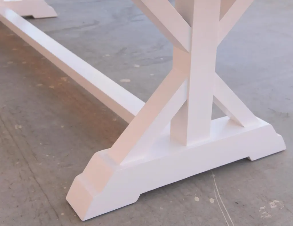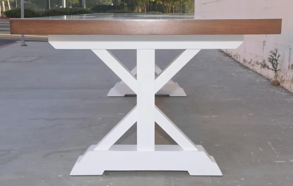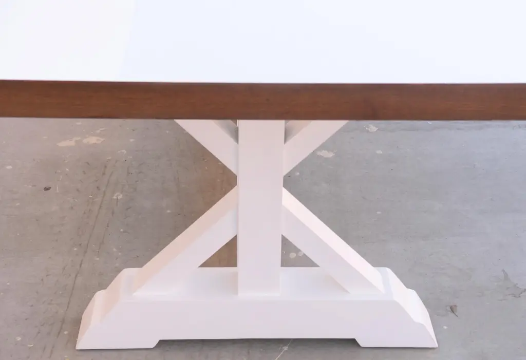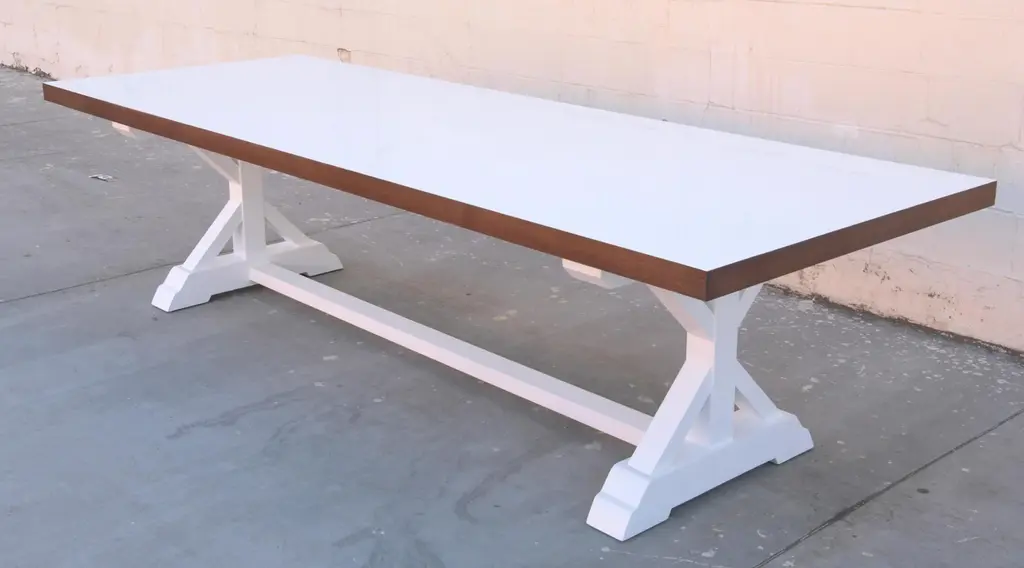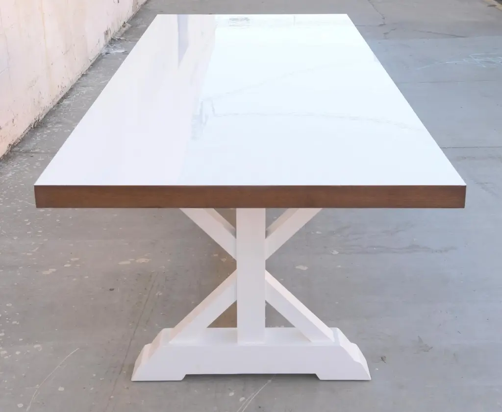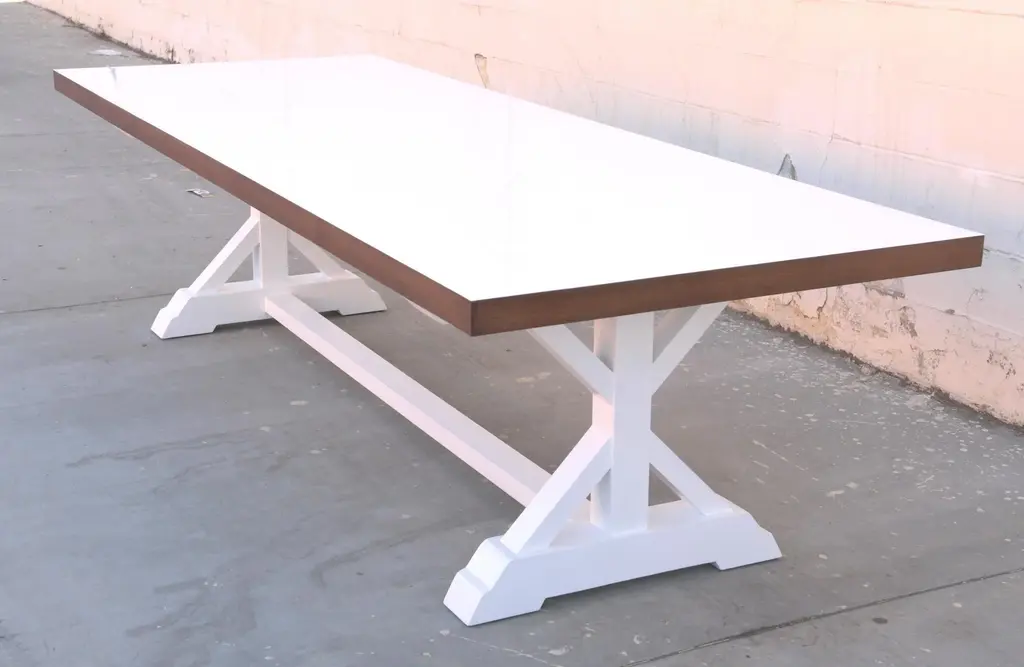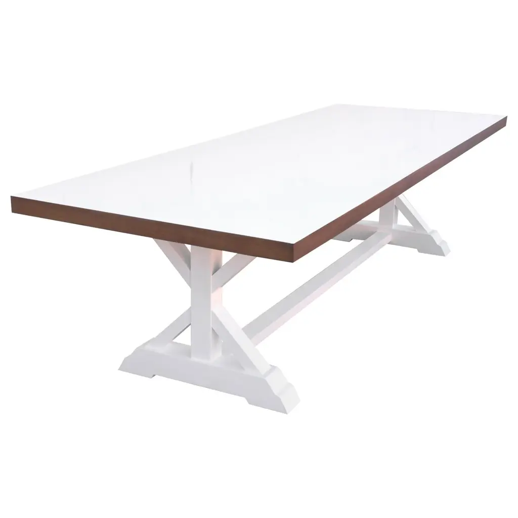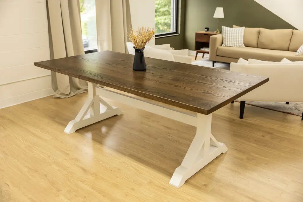This custom dining table is made from oak with white lacquered top and base. It is seen here in 120" x 42" x 30" H Because each table is bench-made in our own Los Angeles workshop you can influence all aspects of design, including size, wood species, and finish. We use only traditional carpentry techniques, no nails or metal fasteners of any kind.