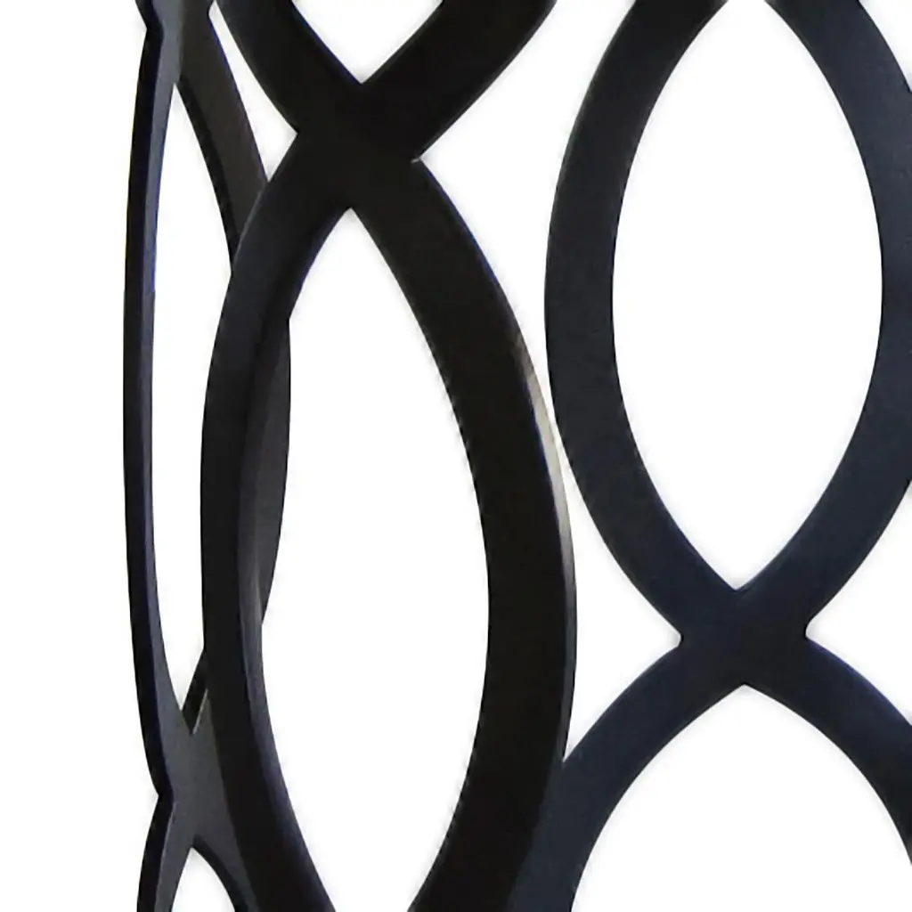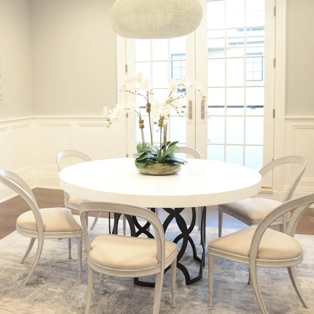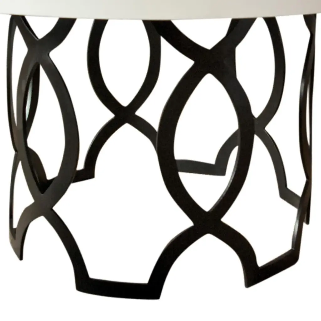 Round dining table with a handmade metal base. White lacquered wooden round top.