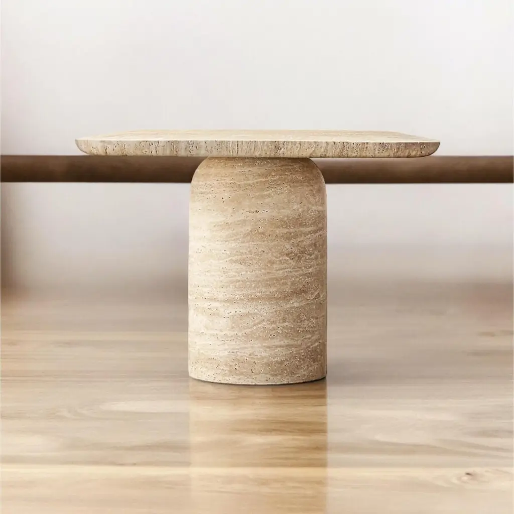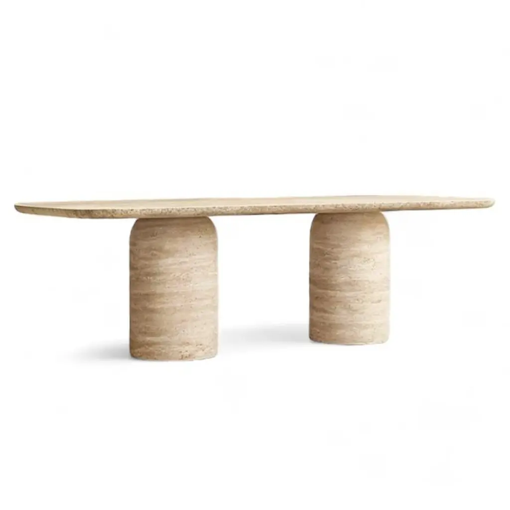‘ELYSIAN Travertine Dining Table’Elevate your dining experience with the ELYSIAN Travertine Dining Table, a stunning centerpiece that seamlessly blends elegance and functionality. Crafted from premium travertine, this table boasts a smooth surface enhanced by an innovative nano-technology coating. This special coating preserves the natural beauty of the travertine while providing superior stain resistance against wine, oil, and other common spills. Its robust cylindrical legs exude modern sophistication, making it perfect for adding a touch of luxury to any dining room. Designed for a lifetime of use, the ELYSIAN table is a timeless investment in style and durability.•Material: High-quality natural travertine•Design: Rectangular tabletop with rounded edges supported by two cylindrical bases•Surface: Stain-resistant nano-technology coating maintains natural look•Durability: Built to last a lifetime•Dimensions: Customizable to fit your space•Color: Beige with natural stone variations•Usage: Ideal for dining rooms, formal settings, and contemporary interiors Every HAAND piece is hand-made by our expert stonemasons. All stone has variations, much like a fingerprint, each piece is uniquely its own. This is the beauty of natural stone.CUSTOM ORDER AVAILABLE UPON REQUESTSPECIFICATON• Size Options A: 160 cm W x 91 cm D x 75 cm H (63"x36"Dx29.5"H) Seats up to 4-6B: 183 cm W x 91 cm D x 75 cm H (72"Wx36"Dx29.5"H) Seats up to 6-8C: 205 cm W x 91 cm D x 75 cm H (81"Wx36"Dx29.5"H) Seats up to 8-10• Finish Cream Beige Travertine• Origin Ethically Handmade in Turkey by Haand Craft stone artisans• Care Wipe clean• Package It is shipped in a wooden crate with DHL Express Installation Place the top on the bases.