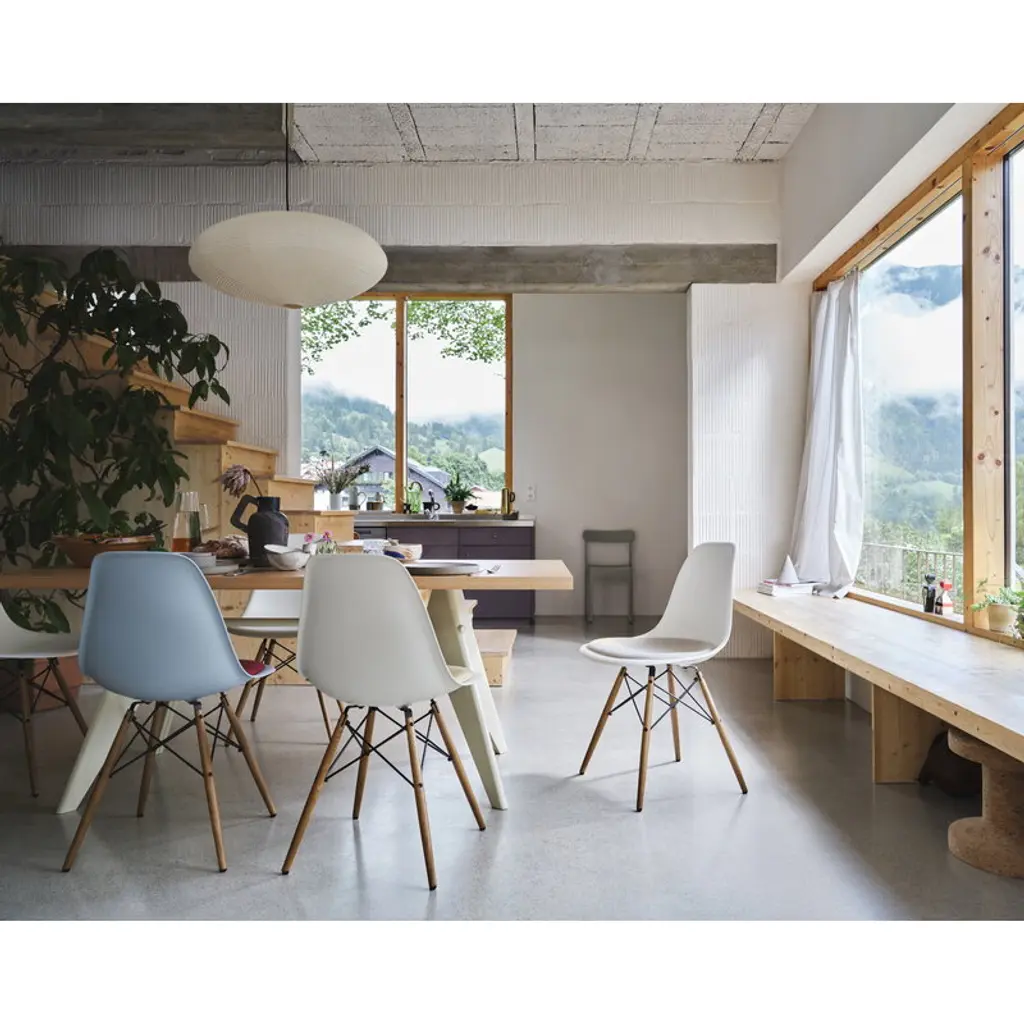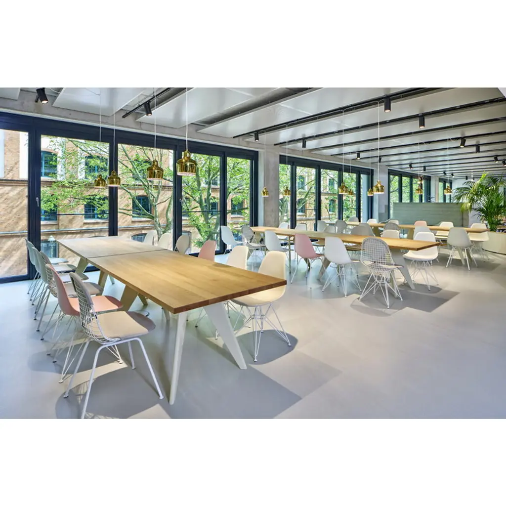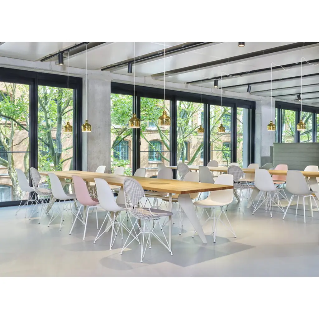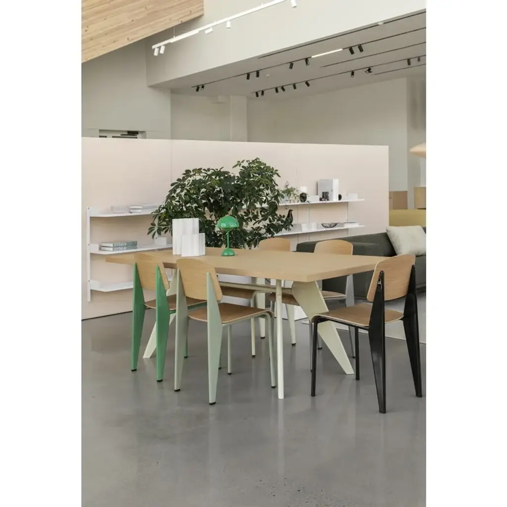 Vitra’s EM Table is a streamlined table which was designed by the French engineer and designer Jean Prouvé for the modernist, prefabricated housing project La Maison Tropicale in 1950. EM Table’s powder-coated steel frame and diagonal legs adhere to the structural principles of architecture and engineering. The simple, rectangular tabletop is available in solid wood or laminate. EM Table is a timeless classic as a dining or conference table, and its shape and colors match seamlessly with Prouvé’s Standard chairs.