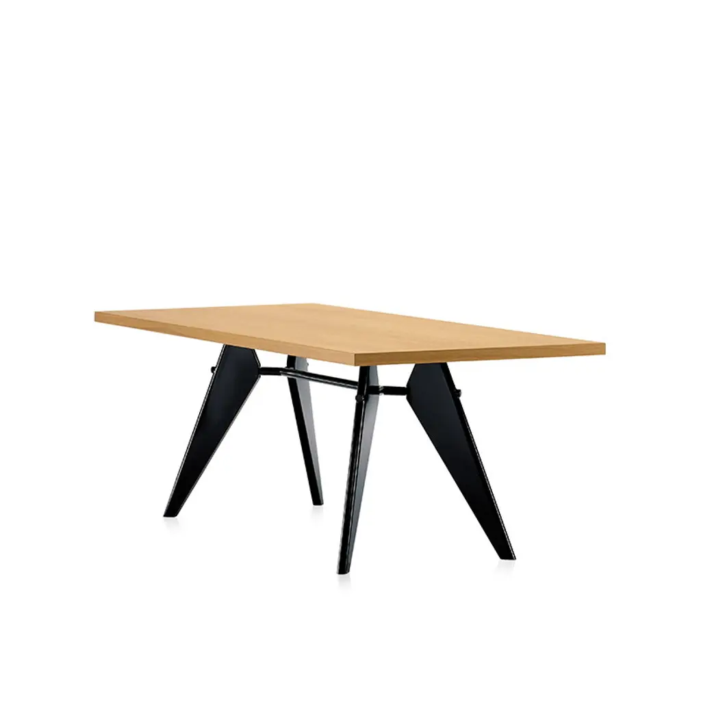 Vitra’s EM Table is a streamlined table which was designed by the French engineer and designer Jean Prouvé for the modernist, prefabricated housing project La Maison Tropicale in 1950. EM Table’s powder-coated steel frame and diagonal legs adhere to the structural principles of architecture and engineering. The simple, rectangular tabletop is available in solid wood or laminate. EM Table is a timeless classic as a dining or conference table, and its shape and colors match seamlessly with Prouvé’s Standard chairs.