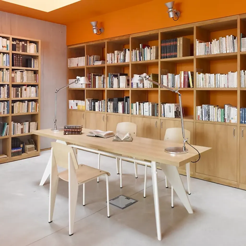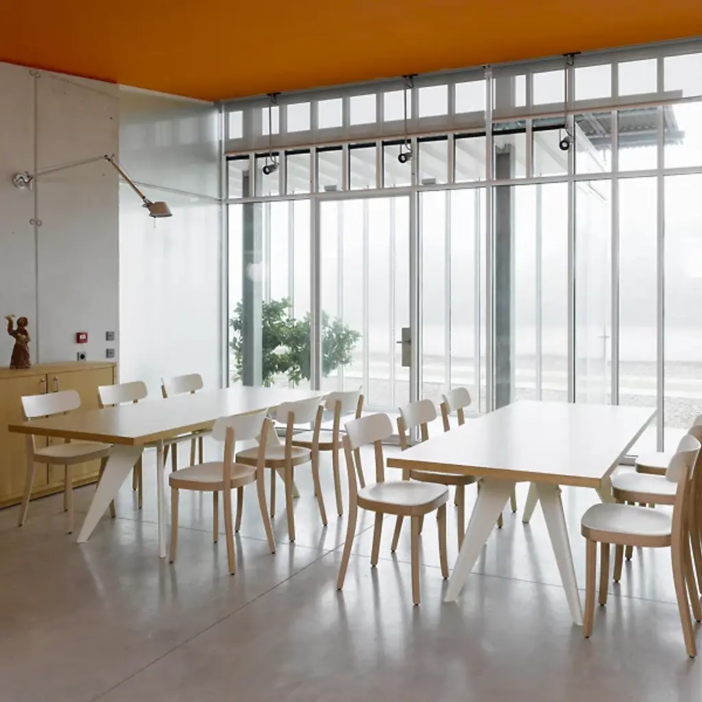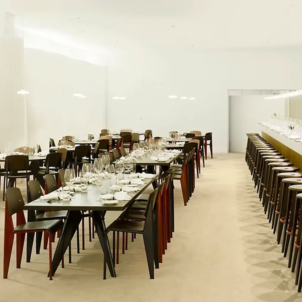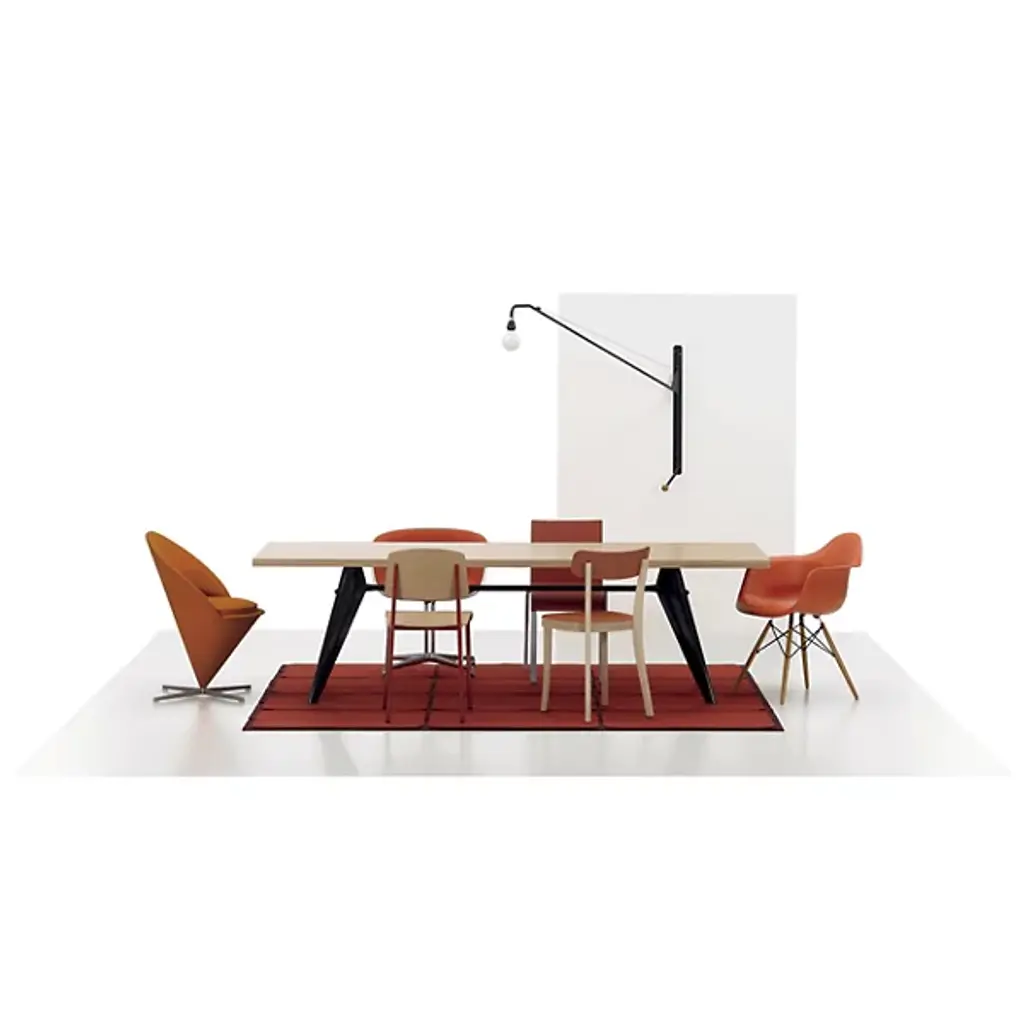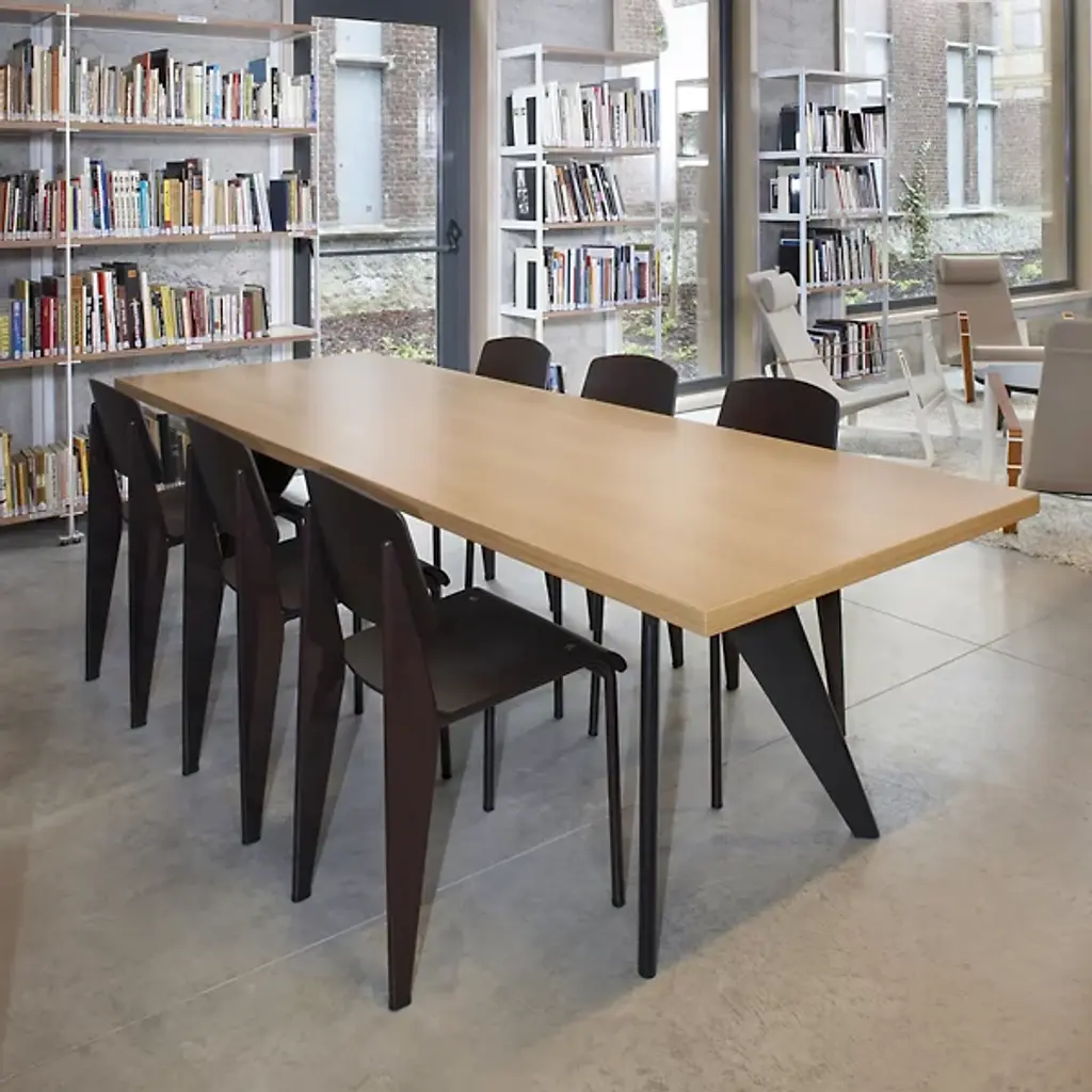 The Vitra EM Table is as much an impressive feat of engineering as it is a beautifully modern dining table. Designed by Jean Prouve in 1950, EM features distinctively angled molded sheet steel legs that are canted inward and held in tension by a tubular steel crossbar. The resulting structure is stable and more than strong enough to support the solid wood top.