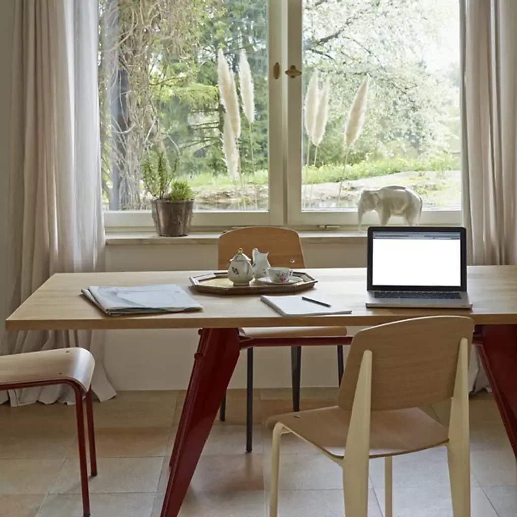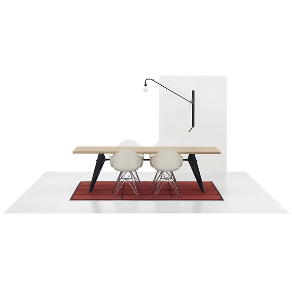 The Vitra EM Table is as much an impressive feat of engineering as it is a beautifully modern dining table. Designed by Jean Prouve in 1950, EM features distinctively angled molded sheet steel legs that are canted inward and held in tension by a tubular steel crossbar. The resulting structure is stable and more than strong enough to support the solid wood top.