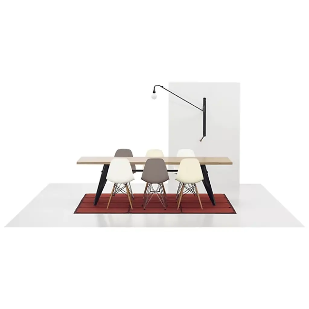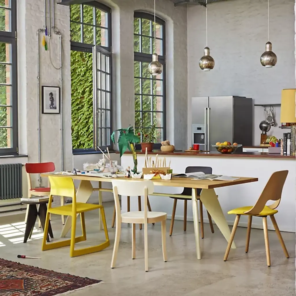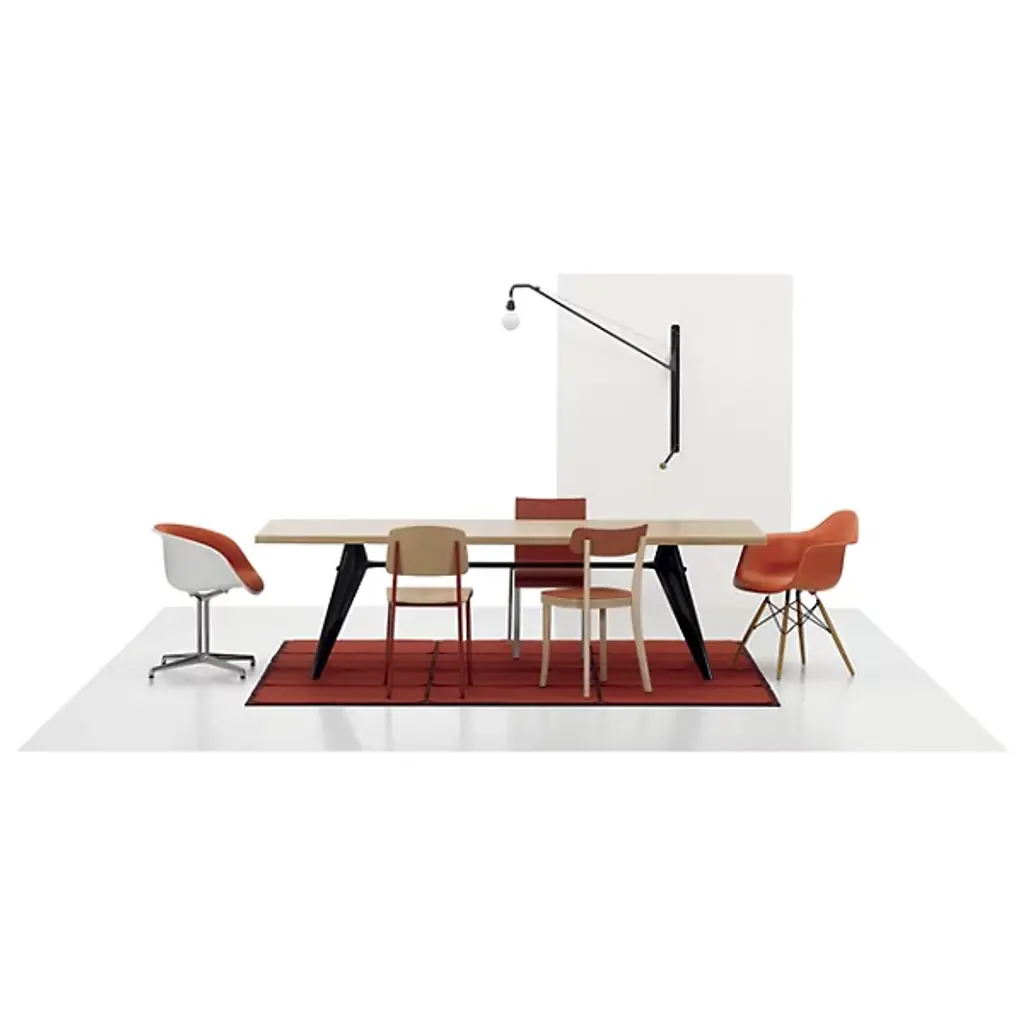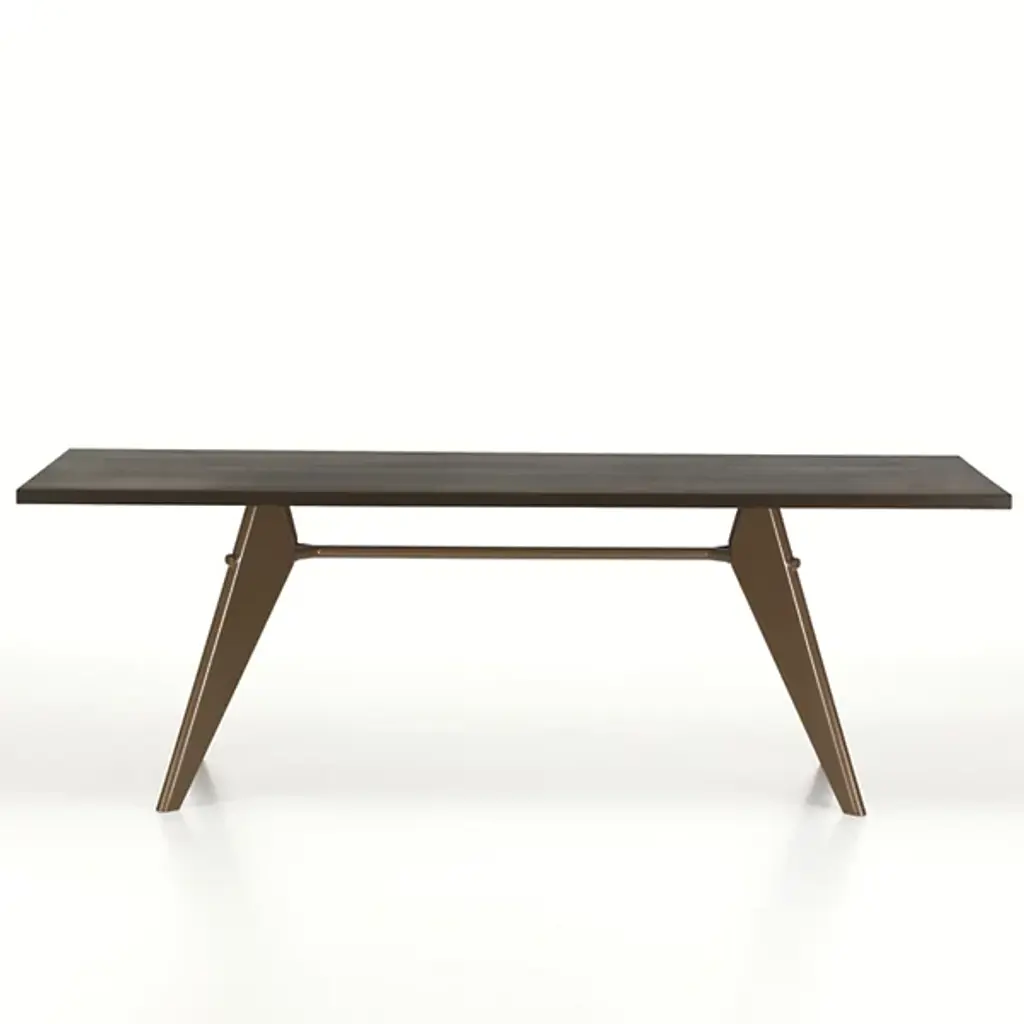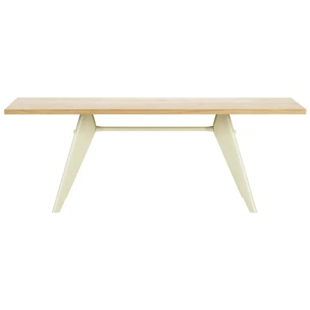 The Vitra EM Table is as much an impressive feat of engineering as it is a beautifully modern dining table. Designed by Jean Prouve in 1950, EM features distinctively angled molded sheet steel legs that are canted inward and held in tension by a tubular steel crossbar. The resulting structure is stable and more than strong enough to support the solid wood top.