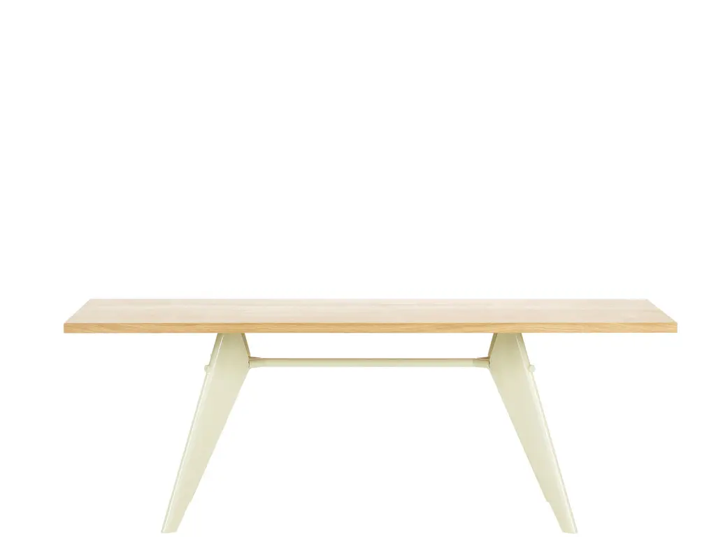 The aesthetic appearance of Jean Prouvé's EM Table adheres to structural principles, illustrating the flow of forces and stresses in its construction. It comes in a range of sizes with table tops in premium solid wood or HPL laminate in a choice of colours. Tops measuring 2000 or 2400 mm in length are also available in oak veneer. Thanks to this wide selection, the ideal EM Table can be found for every dining room.