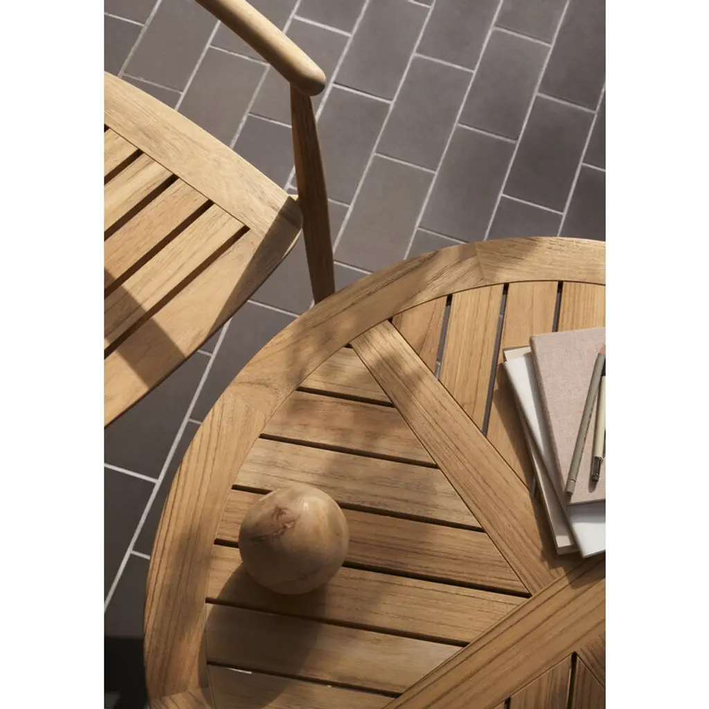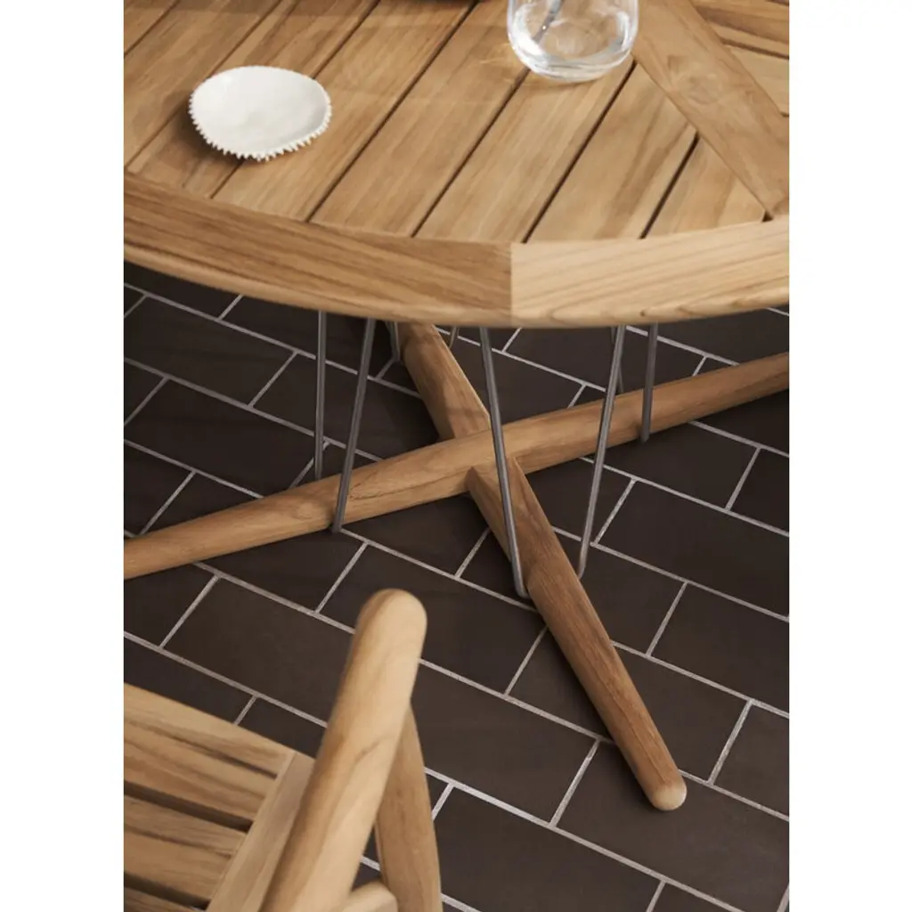 Carl Hansen & Søn's Embrace E022 dining table delights with its distinctive appearance, a charming combination of wood and steel. Designed by EOOS, the round terrace table features a rigid steel wire alongside a solid base and a tabletop made of wood – the contrast between different materials makes the look of the garden table modern yet natural. This is thanks to the wooden surface: untreated teak will patinate with use and time and become even more unique. If you prefer an original tone, we recommend treating teak furniture with a suitable teak sealant. The Embrace table is ideal for outdoor use in the garden and on the terrace, and with different sizes to choose from, there's a version to suit even the smallest balcony. Combine the stylish table with the garden chairs from the Embrace collection to create a harmonious set that captivates your yard year after year!