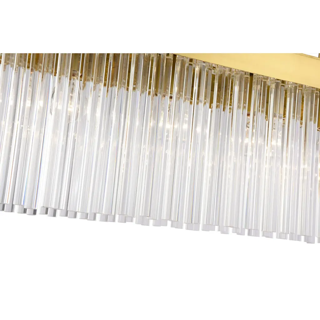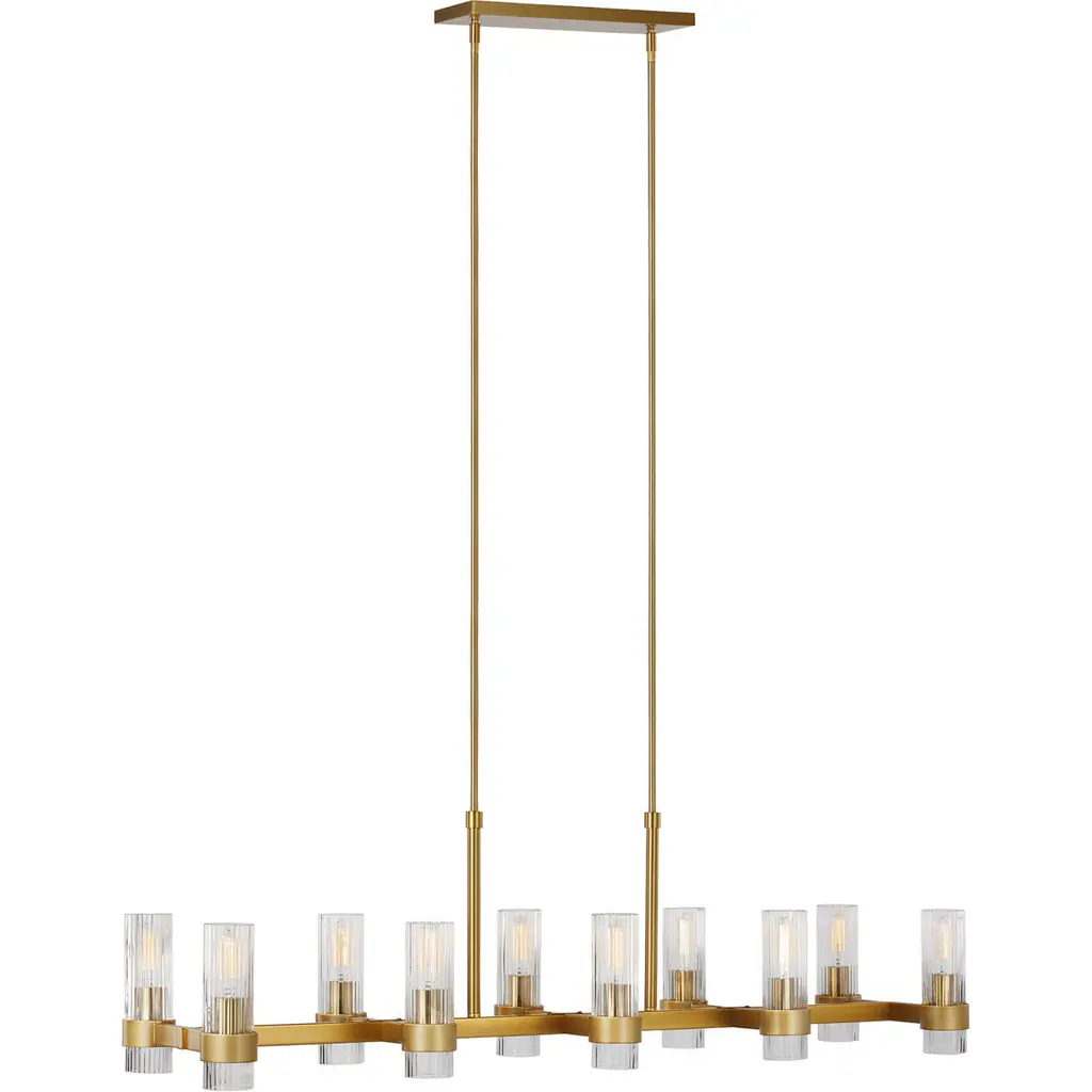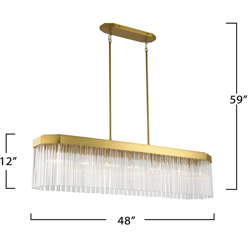 The linear chandelier from the Emma collection by designer Kevin Kraemer is a captivating blend of elegance and geometry. Individual glass rods, delicately suspended from a brushed brass hexagonal frame, shimmer with timeless sophistication, creating a mesmerizing interplay of light. Complemented by a matching hexagonal canopy, this design brings an air of modern luxury to any space. A perfect addition to any dining room with rectangular table or perhaps in a kitchen over an island.