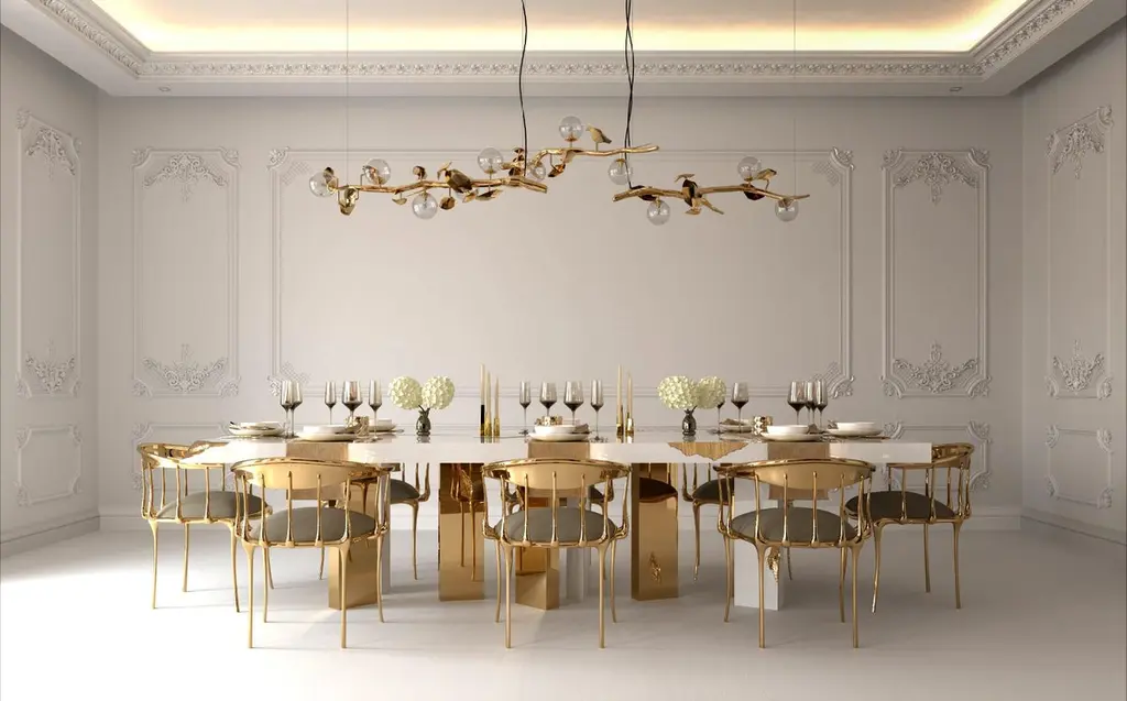 Great Empires take centuries to build, and those who rise after taking a fall find their true strength. It goes without saying that great decisions are taken around powerful tables among determined minds. The Empire dining table symbolizes generations of gatherings and decisions, both in times of celebration or tension. Its cracks reflect tough times, revealing a gold interior in a manifesto towards power. Flawless and bright, the remaining surface points towards a thriving future, reminding one to toast to prosperity.