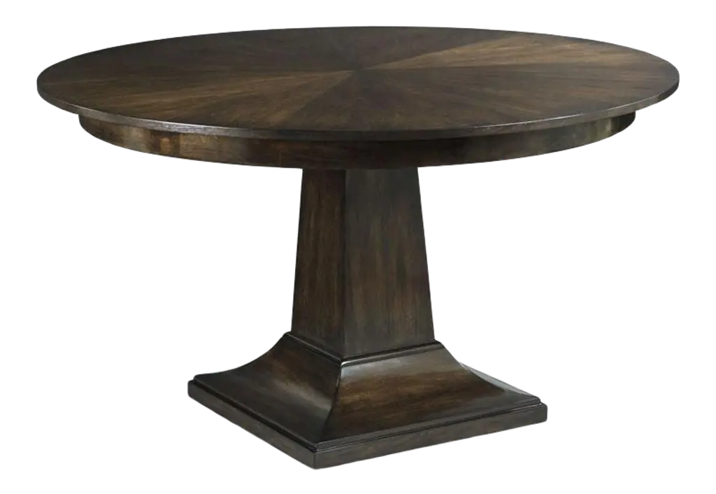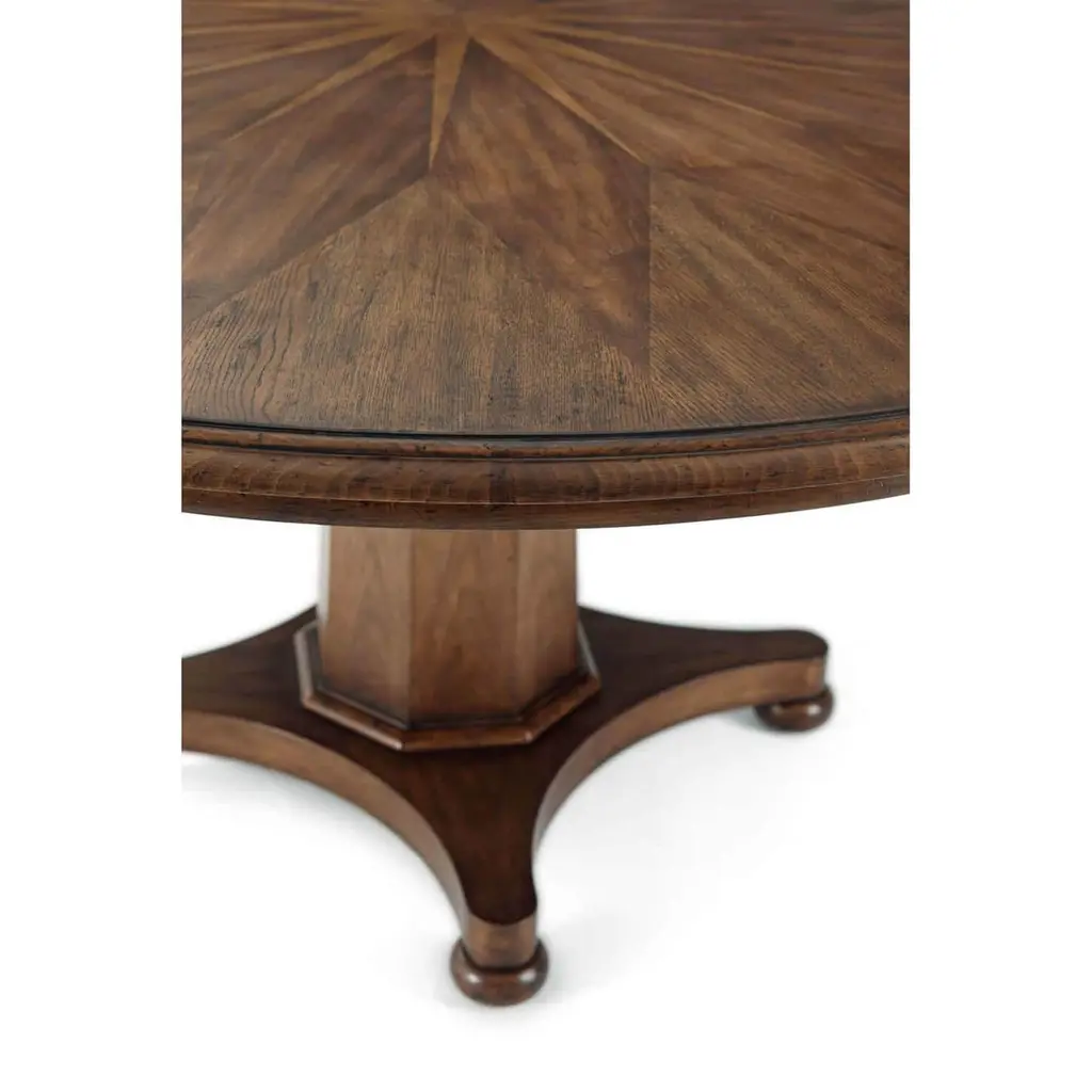 Empire style round dining table with beech and quartered walnut veneer and a stellar parquetry inlaid top with a molded edge on a tapered octagonal column base and quatrefoil concave sided platform base raised on bun feet.Dimensions: 64" W x 64" D x 30" H.