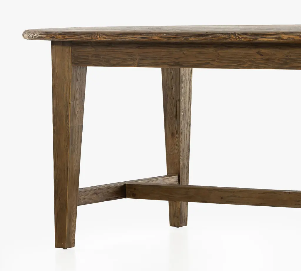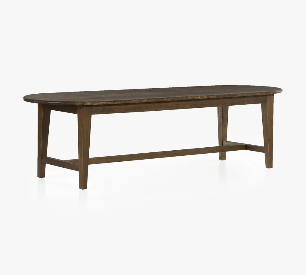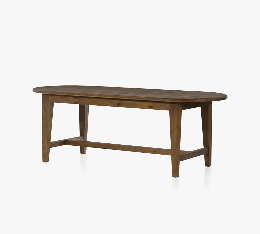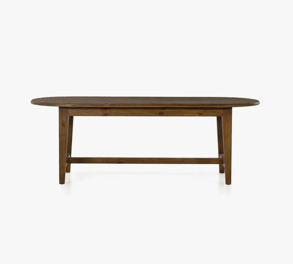 Crafted from solid pine, our dining table brings a relaxed farmhouse feel to your home. The unadorned silhouette features tapered legs and an expansive oval top that is complemented by a stretcher and apron for a traditional touch. Perfect for a country home but streamlined enough for a contemporary interior.