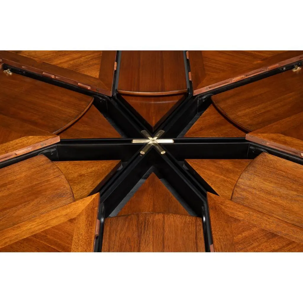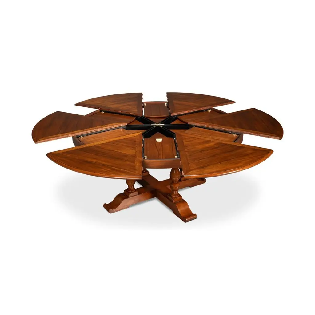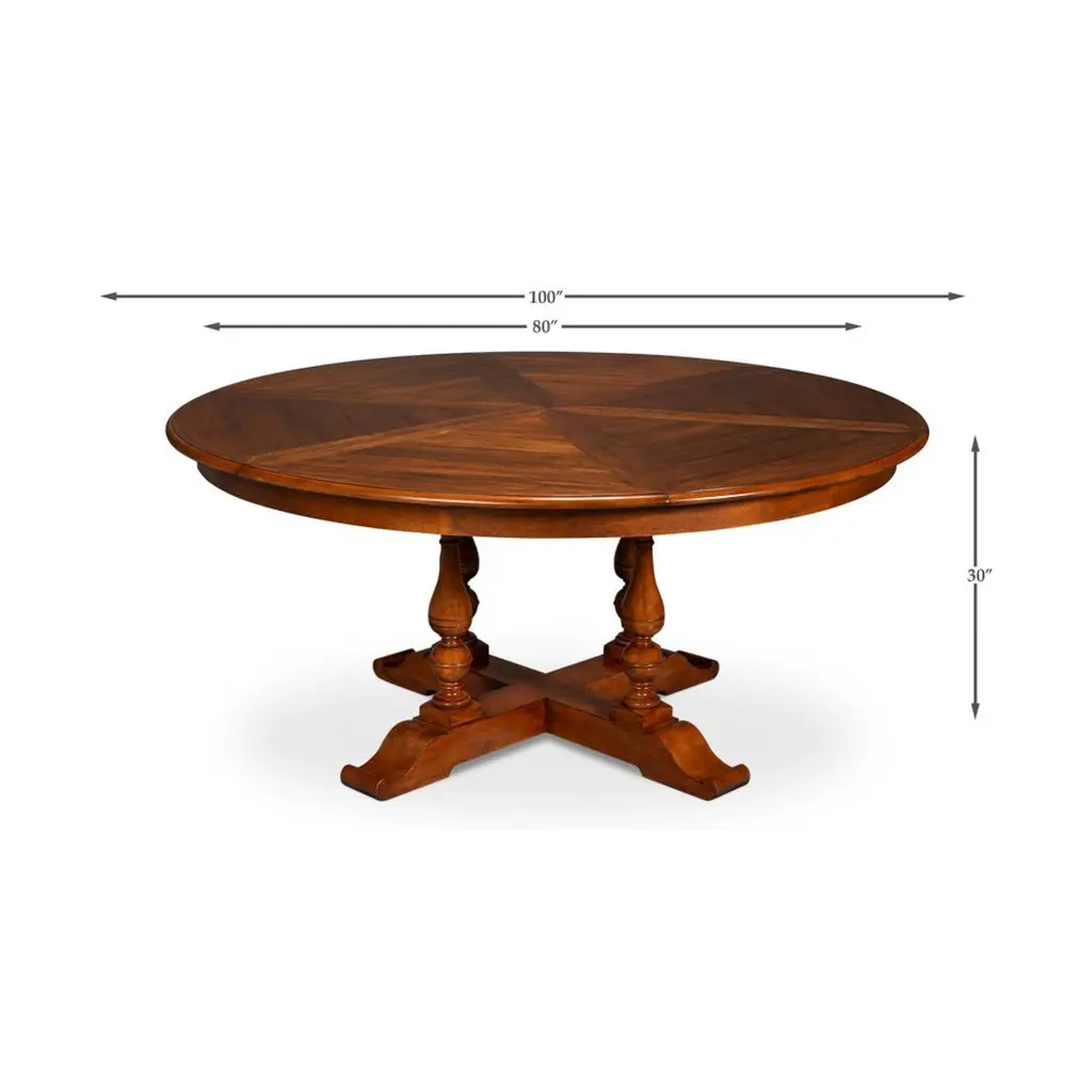 Featuring an Old World walnut finish, and a farmhouse-patterned walnut top, supported by four beautifully turned baluster wood uprights connected to a classic X-frame style base. This table incorporates a re-engineered extension mechanism, a 19th-century innovation modernized with durable aluminum. The self-storing mechanism allows for effortless expansion, ensuring smooth operation and simplified assembly.Ideal for both intimate dinners and larger gatherings, this table offers a seamless combination of traditional craftsmanship and contemporary convenience.Open Dimensions: 100" W x 100" D x 30" HClosed: 80" D x 80" D x 30" H