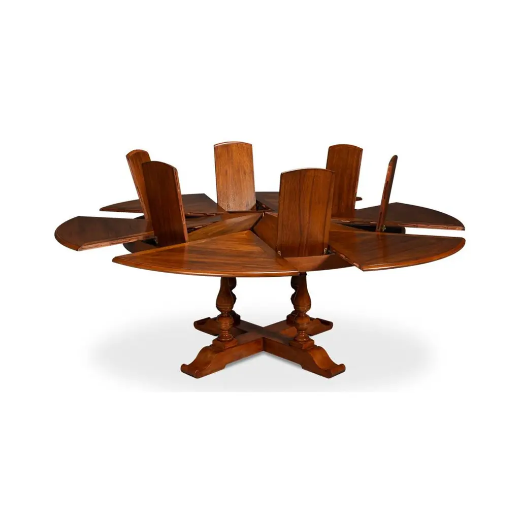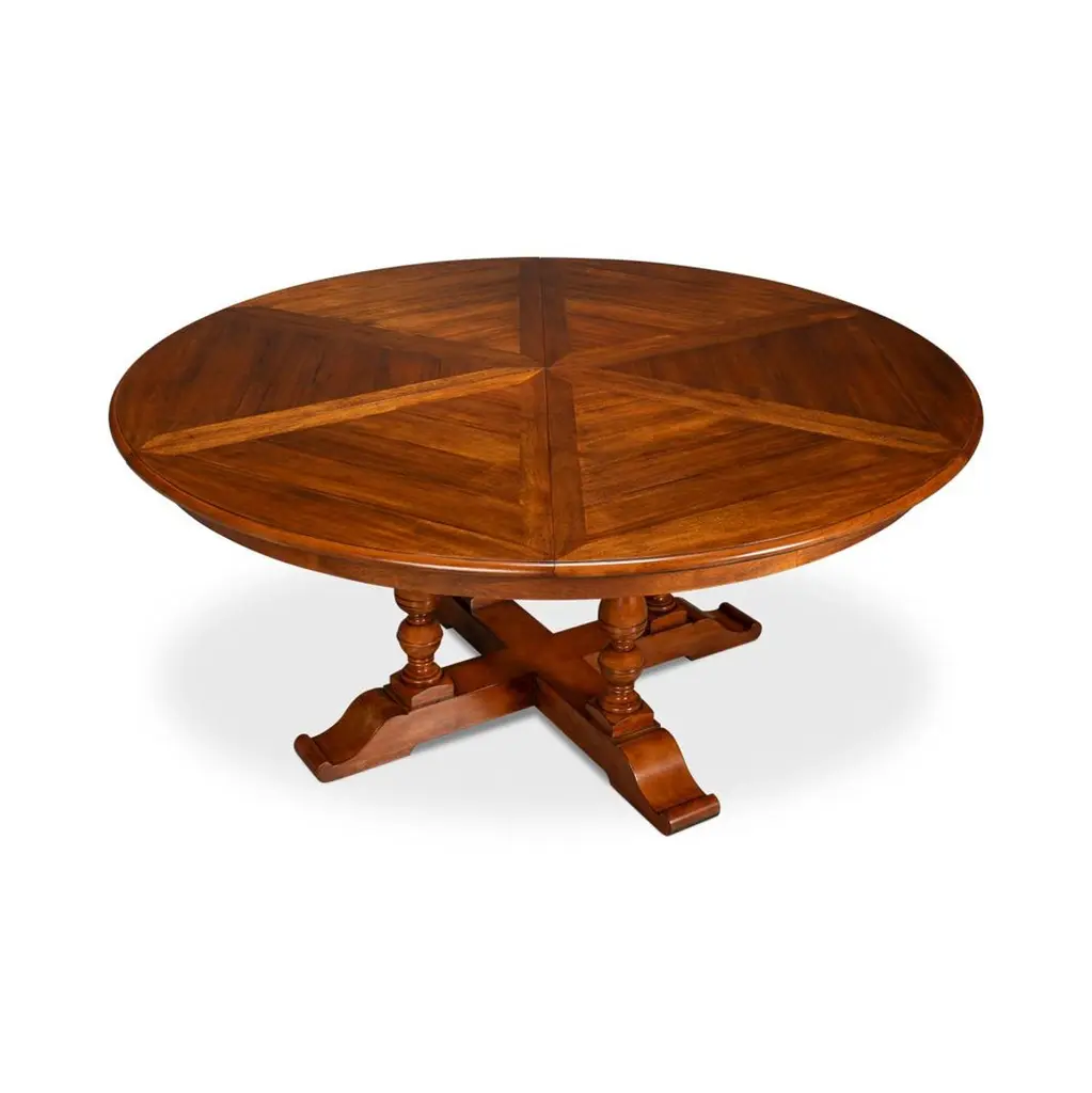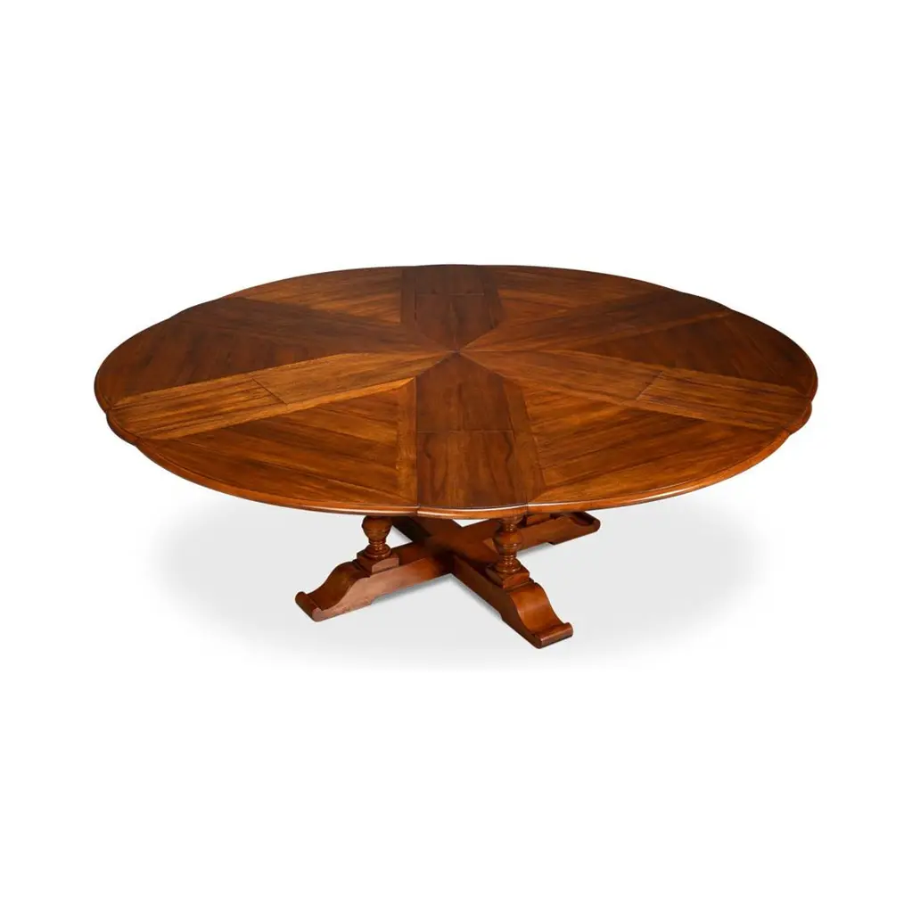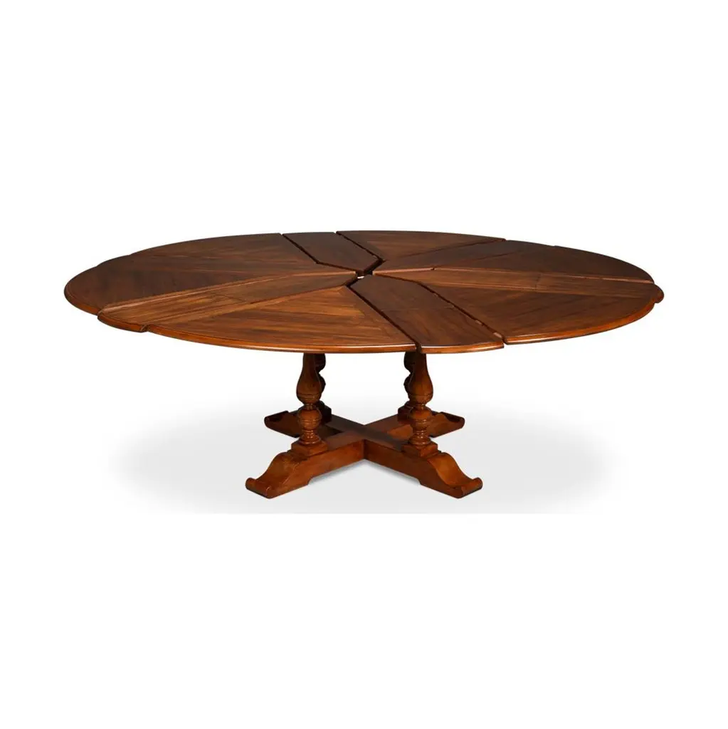 Featuring an Old World walnut finish, and a farmhouse-patterned walnut top, supported by four beautifully turned baluster wood uprights connected to a classic X-frame style base. This table incorporates a re-engineered extension mechanism, a 19th-century innovation modernized with durable aluminum. The self-storing mechanism allows for effortless expansion, ensuring smooth operation and simplified assembly.Ideal for both intimate dinners and larger gatherings, this table offers a seamless combination of traditional craftsmanship and contemporary convenience.Open Dimensions: 71.5" W x 71.5" D x 30" HClosed: 55" D x 55" D x 30" H