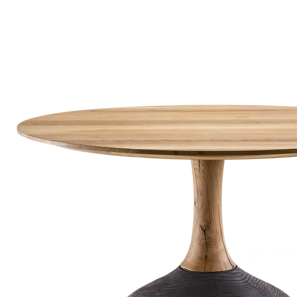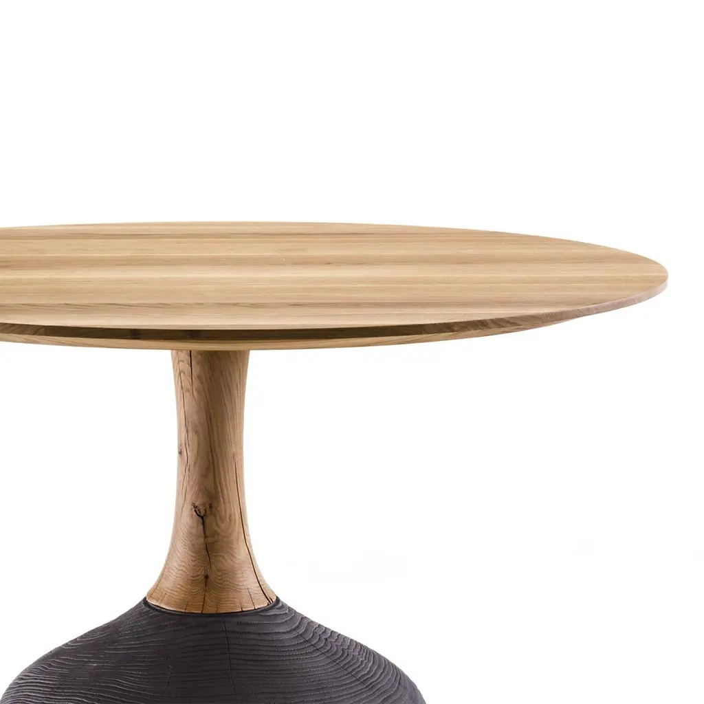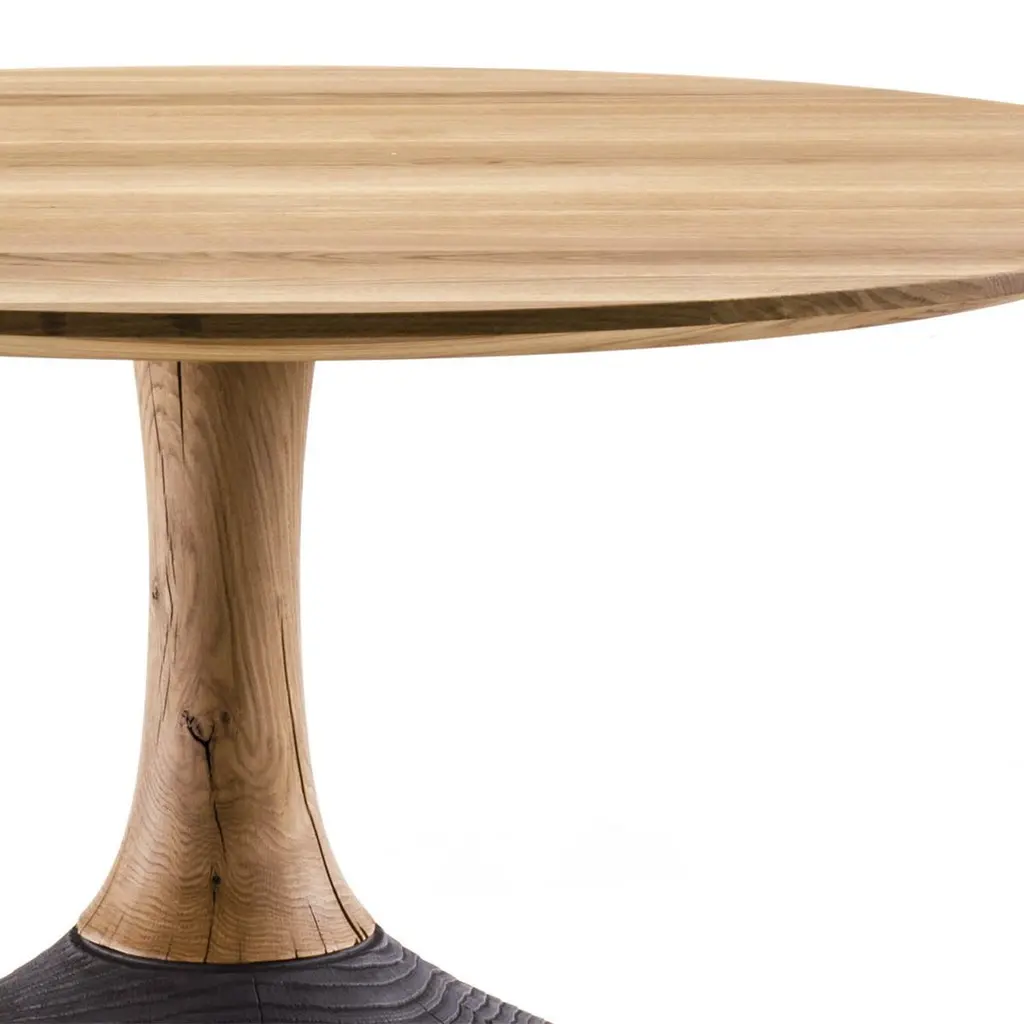 Dining table Ennio round with top made of solid oakglued slats, with central leg in solid oak and with basein solid cedar in burnt finish.Available on request in:Diameter 80 x Height 74,5cm, price: 6900,00€Diameter 100 x Height 74,5cm, price: 8700,00€Diameter 120 x Height 74,5cm, price: 9400,00€Diameter 130 x Height 74,5cm, price: 9900,00€Diameter 160 x Height 74,5cm, price: 11900,00€Also available with top and central leg in solid walnut woodwith base in solid cedar wood in burnt finish, including up-charge,on request.