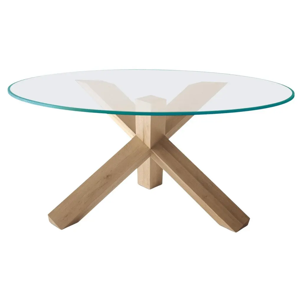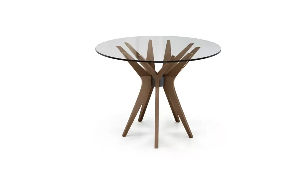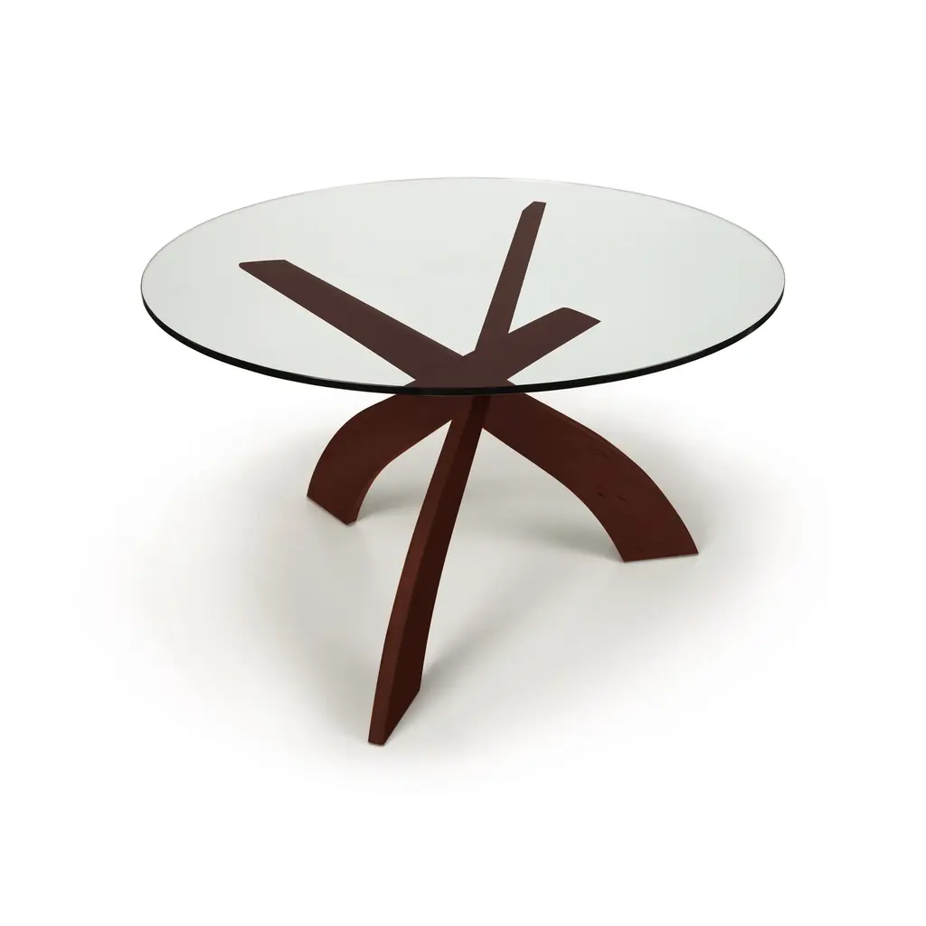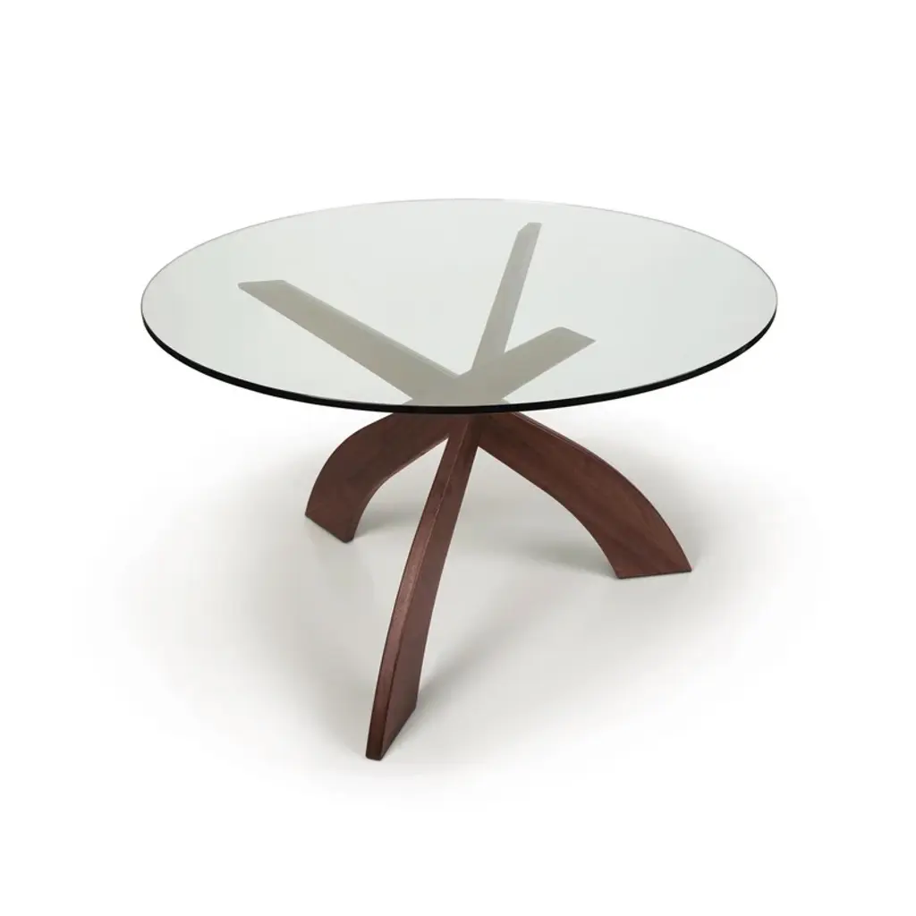 The Entwine Round Dining Table from Copeland Furniture is an essential piece of furniture for the contemporary loft-living lifestyle. Its clean glass top and solid natural walnut finish evoke an elegant, luxurious atmosphere, with comfortable undertones. Its unique design features a crossed base, available in three sizes of glass top, and the natural walnut finish proudly displays its natural grain for a custom, unique look. Highlights
