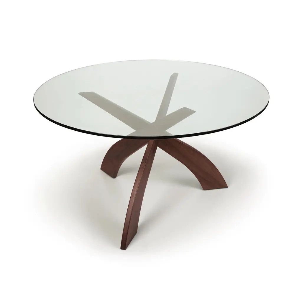 The Entwine Round Dining Table from Copeland Furniture is an essential piece of furniture for the contemporary loft-living lifestyle. Its clean glass top and solid natural walnut finish evoke an elegant, luxurious atmosphere, with comfortable undertones. Its unique design features a crossed base, available in three sizes of glass top, and the natural walnut finish proudly displays its natural grain for a custom, unique look. Highlights