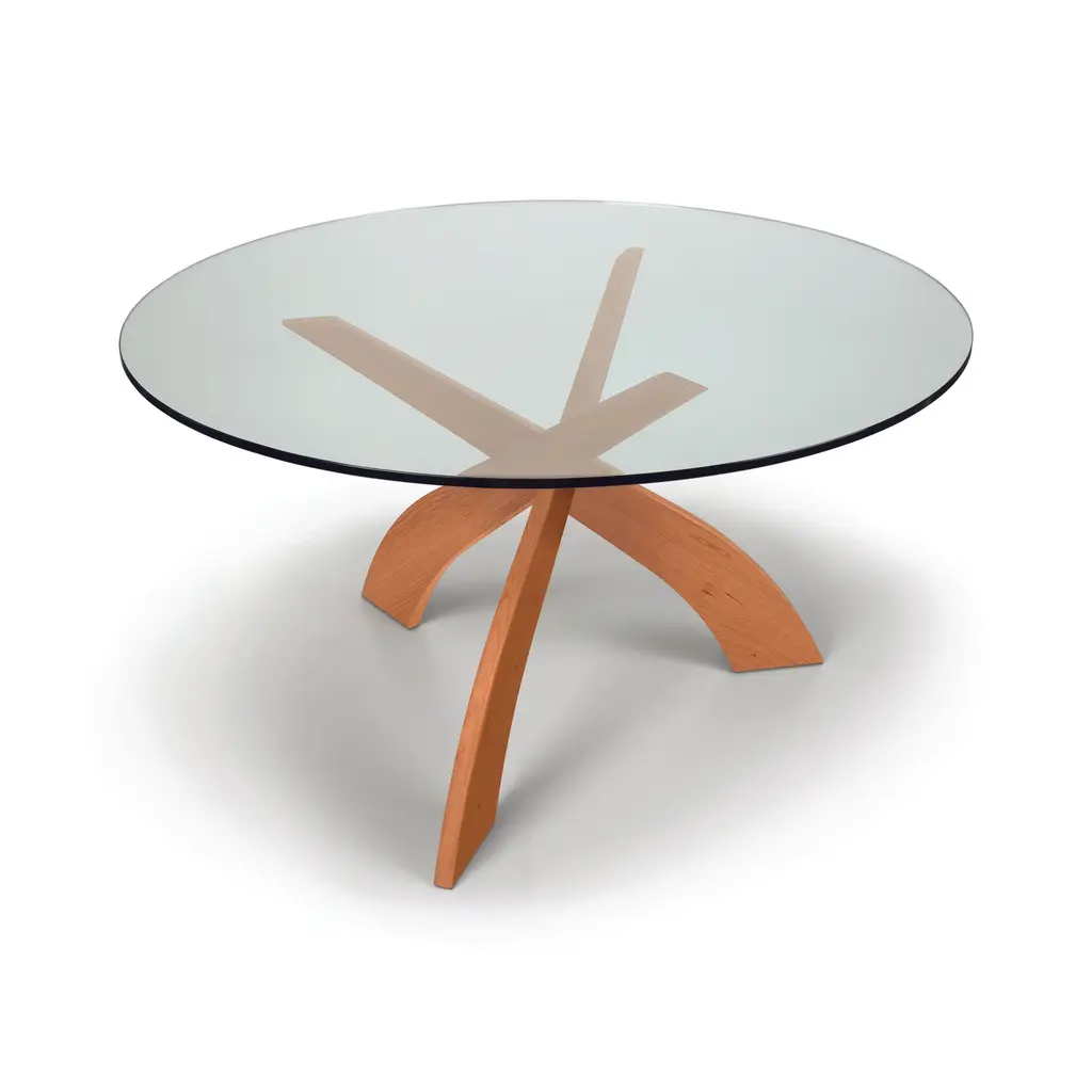 The Entwine Round Dining Table from Copeland Furniture is an essential piece of furniture for the contemporary loft-living lifestyle. Its clean glass top and solid natural walnut finish evoke an elegant, luxurious atmosphere, with comfortable undertones. Its unique design features a crossed base, available in three sizes of glass top, and the natural walnut finish proudly displays its natural grain for a custom, unique look. Highlights