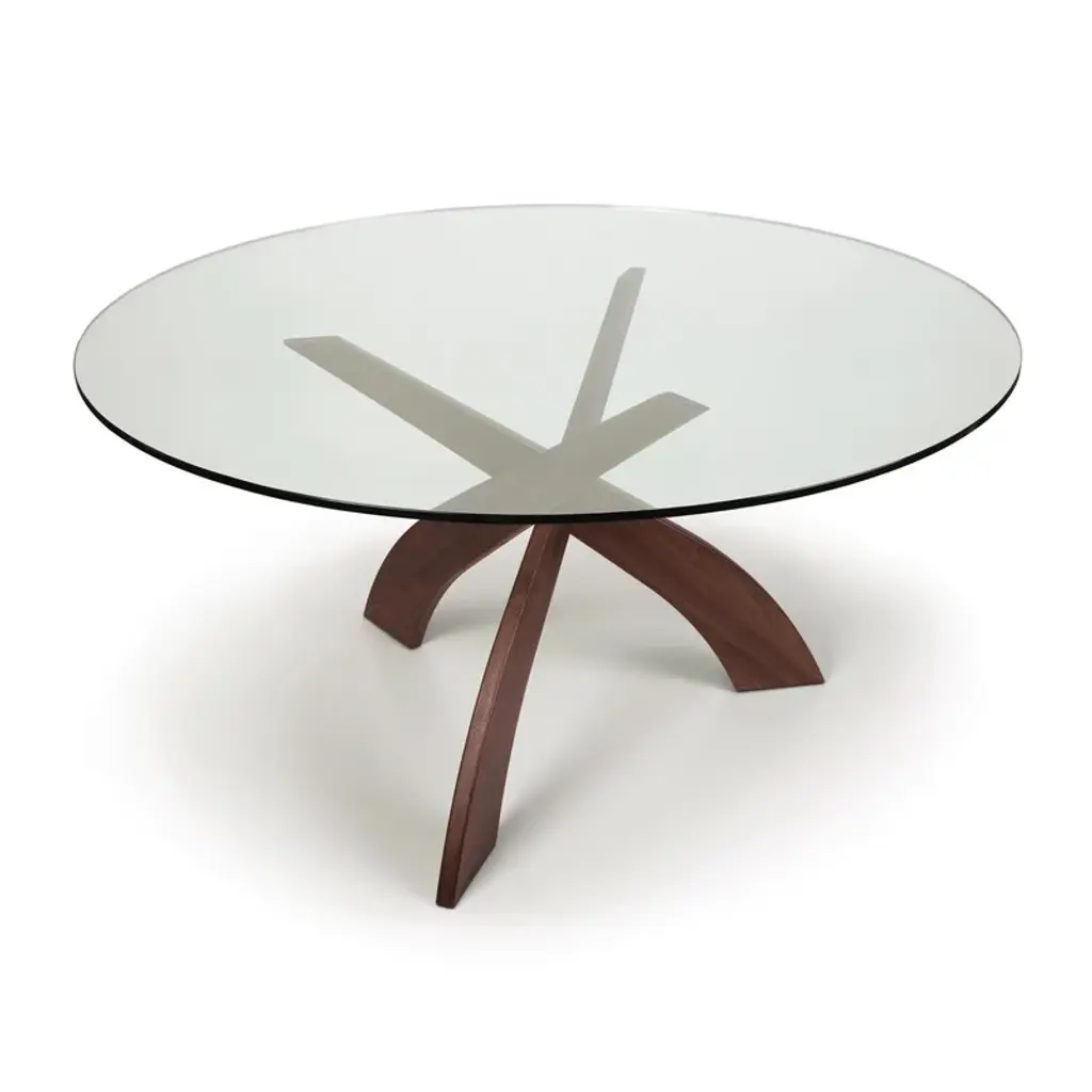The Entwine Round Dining Table from Copeland Furniture is an essential piece of furniture for the contemporary loft-living lifestyle. Its clean glass top and solid natural walnut finish evoke an elegant, luxurious atmosphere, with comfortable undertones. Its unique design features a crossed base, available in three sizes of glass top, and the natural walnut finish proudly displays its natural grain for a custom, unique look. Highlights