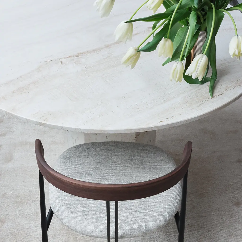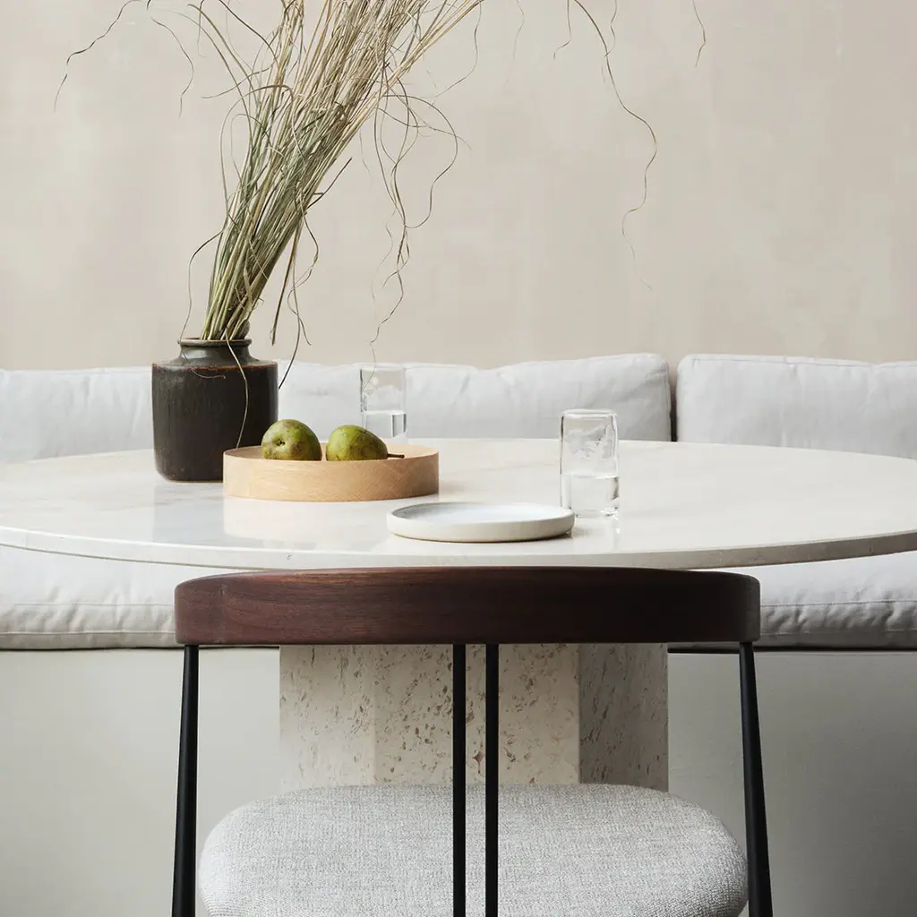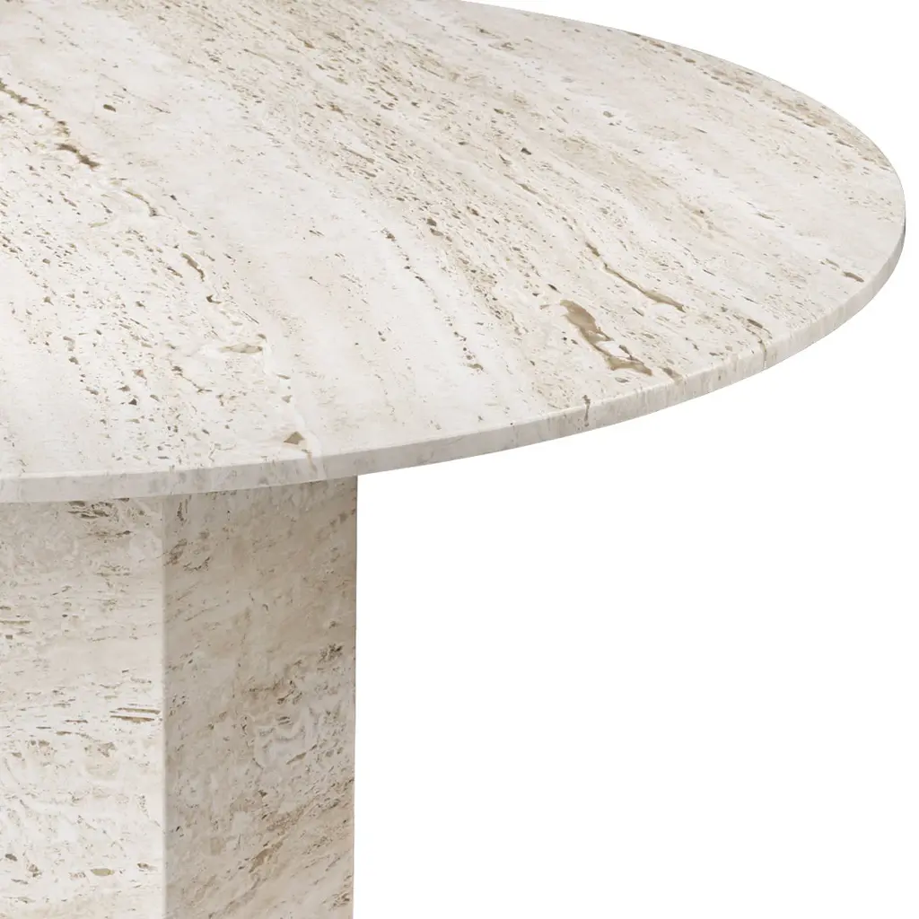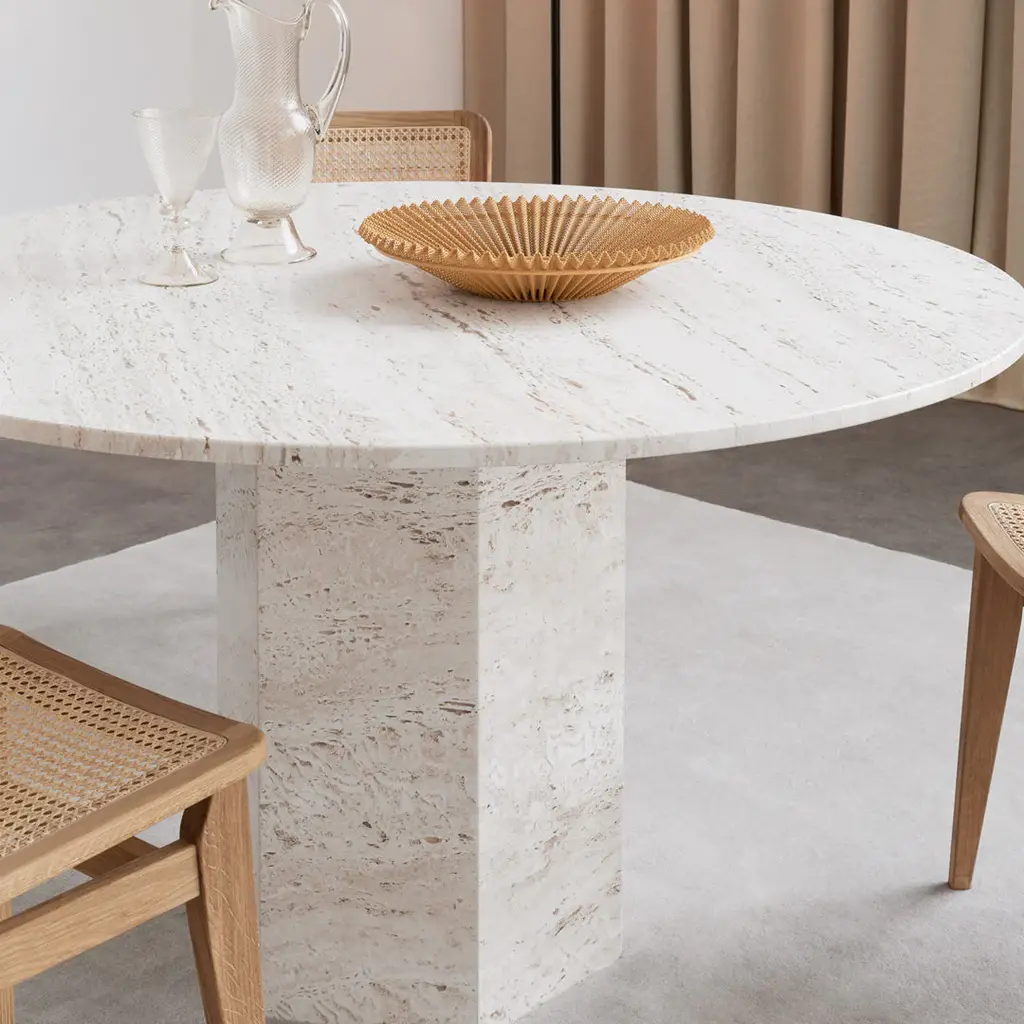 Please note: Each marble slab will vary in appearance, as it is a natural material. We consider that part of the beauty of the piece – where a geometric form produced at a large scale can still be one of a kind. GUBI does not consider the marble grain a defect and will not accept a return based on the grain/color. GamFratesi designed the Epic Coffee Table for GUBI as a sculptural piece of furniture inspired by Greek columns and Roman architecture and named after the epic poems of ancient times. Made in Italy from travertine stone, the monolithic form emphasizes the materiality of the stone, the natural beauty of its veins, and the vibrant texture of its unique patina – in which a new detail can be discovered with every use. Inspired by historical examples of travertine constructions such as the Colosseum and Saint Peter's Basilica in Rome, and the 1970s revival of the material in Southern Europe, the table combines two simple geometric shapes, the circle and the hexagon, with references to the classical Greek column. Stone options in Neutral White, Vibrant Gray or colorful Burnt Red each create a focal point of differing intensity, bringing personality to private settings and naturalness and tactility to public interior spaces. The varying heights and diameters within the Epic Table Series mean a single monochromatic table can stand alone or be combined in dynamic clusters of varying height and color.
