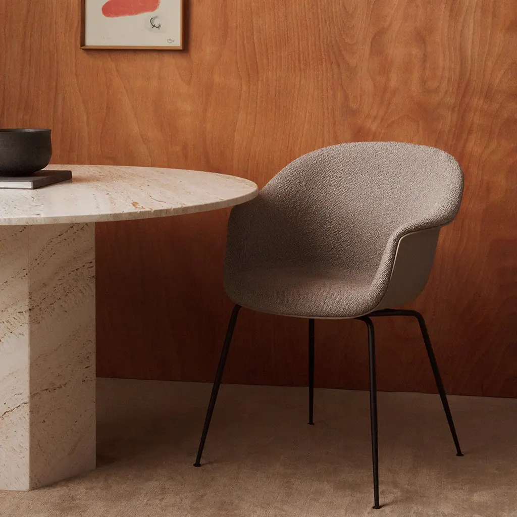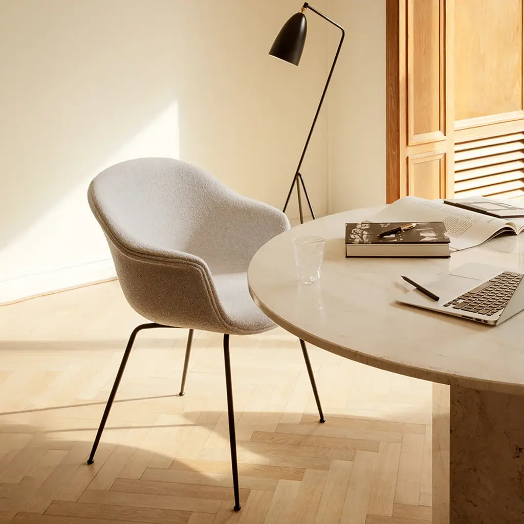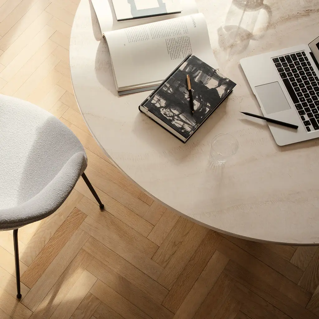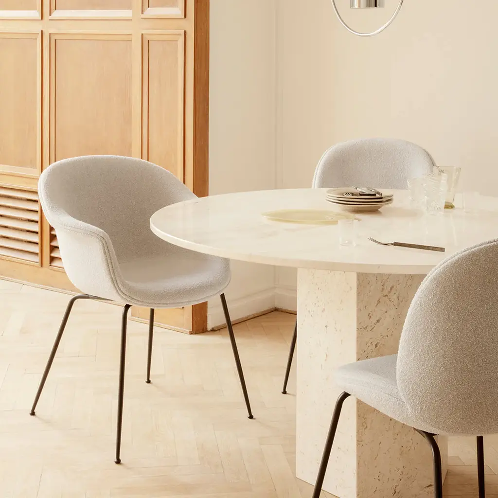 Please note: Each marble slab will vary in appearance, as it is a natural material. We consider that part of the beauty of the piece – where a geometric form produced at a large scale can still be one of a kind. GUBI does not consider the marble grain a defect and will not accept a return based on the grain/color. GamFratesi designed the Epic Coffee Table for GUBI as a sculptural piece of furniture inspired by Greek columns and Roman architecture and named after the epic poems of ancient times. Made in Italy from travertine stone, the monolithic form emphasizes the materiality of the stone, the natural beauty of its veins, and the vibrant texture of its unique patina – in which a new detail can be discovered with every use. Inspired by historical examples of travertine constructions such as the Colosseum and Saint Peter's Basilica in Rome, and the 1970s revival of the material in Southern Europe, the table combines two simple geometric shapes, the circle and the hexagon, with references to the classical Greek column. Stone options in Neutral White, Vibrant Gray or colorful Burnt Red each create a focal point of differing intensity, bringing personality to private settings and naturalness and tactility to public interior spaces. The varying heights and diameters within the Epic Table Series mean a single monochromatic table can stand alone or be combined in dynamic clusters of varying height and color.