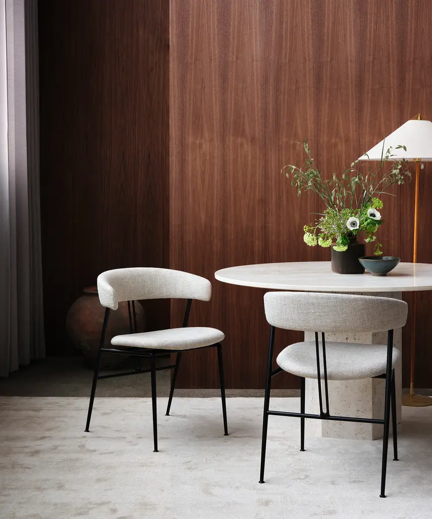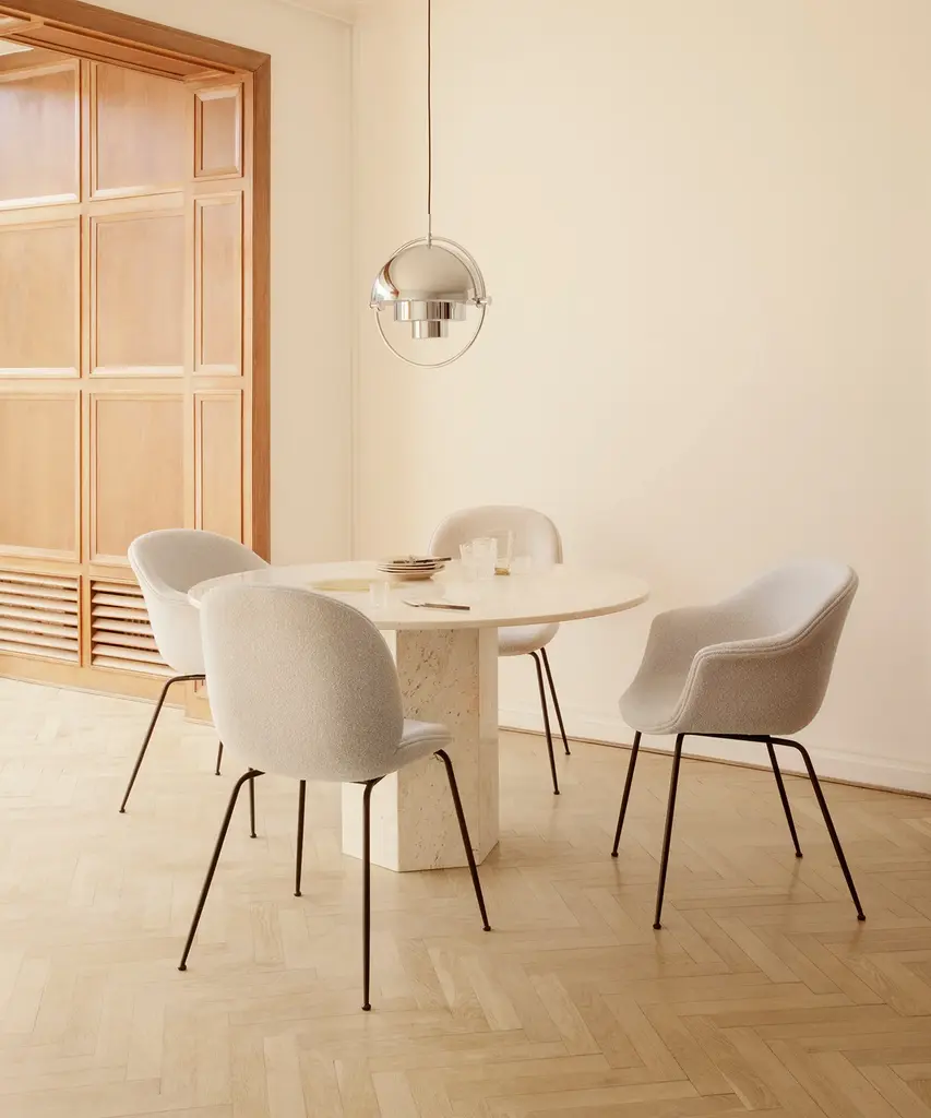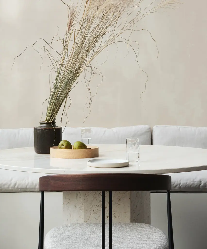 Designed by GamFratesi, the Epic Table is a sculptural piece of furniture inspired by Greek columns and Roman architecture. Made in Italy from travertine stone, the monolithic form emphasizes the materiality of the stone, the natural beauty of its veins, and the vibrant texture of its unique patina. A color palette of Neutral White or Burnt Red enables the impact of the piece to be dialed up or down to suit the interior space. Produced by Danish design publisher, Gubi.