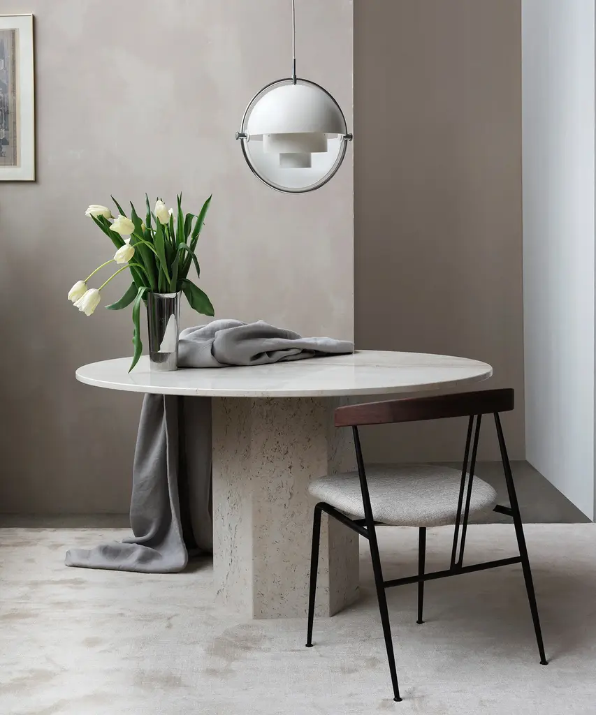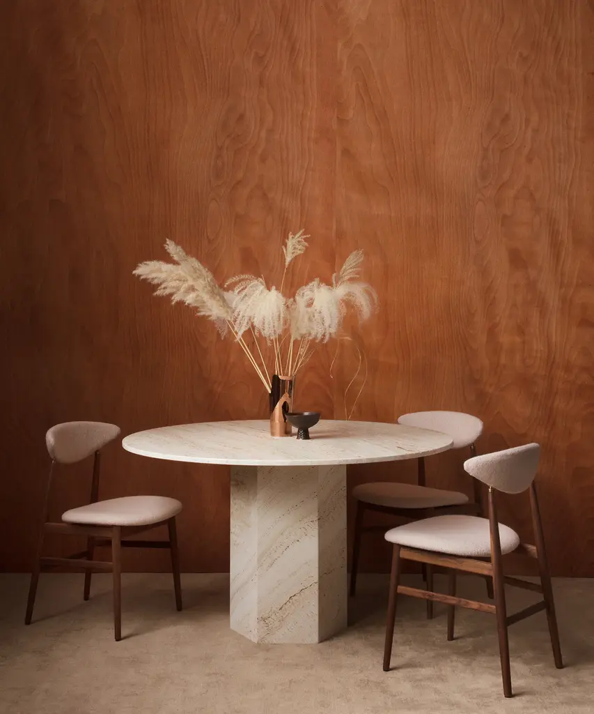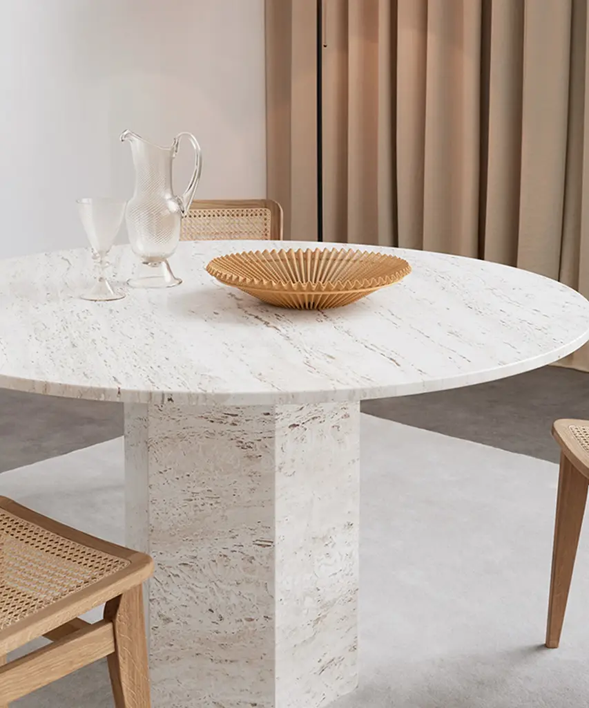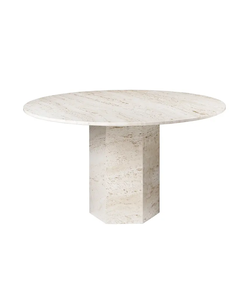Designed by GamFratesi, the Epic Table is a sculptural piece of furniture inspired by Greek columns and Roman architecture. Made in Italy from travertine stone, the monolithic form emphasizes the materiality of the stone, the natural beauty of its veins, and the vibrant texture of its unique patina. A color palette of Neutral White or Burnt Red enables the impact of the piece to be dialed up or down to suit the interior space. Produced by Danish design publisher, Gubi.