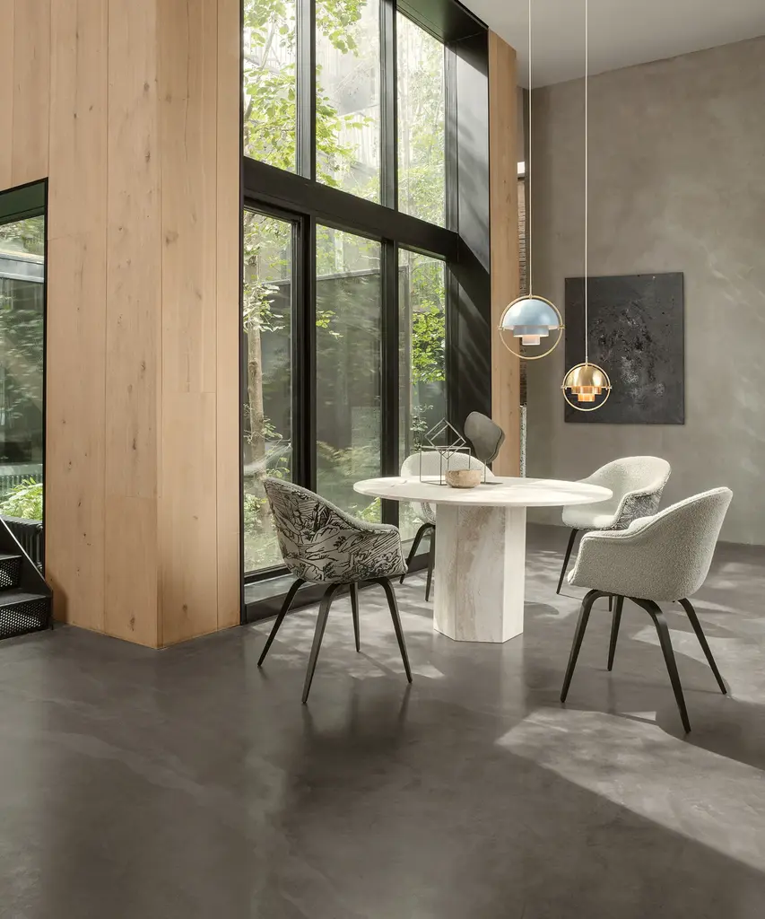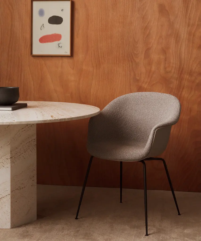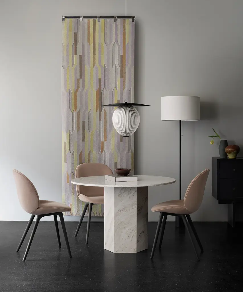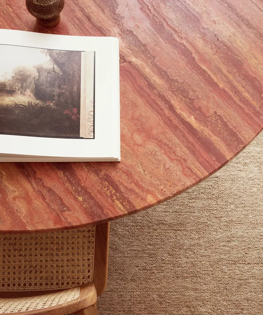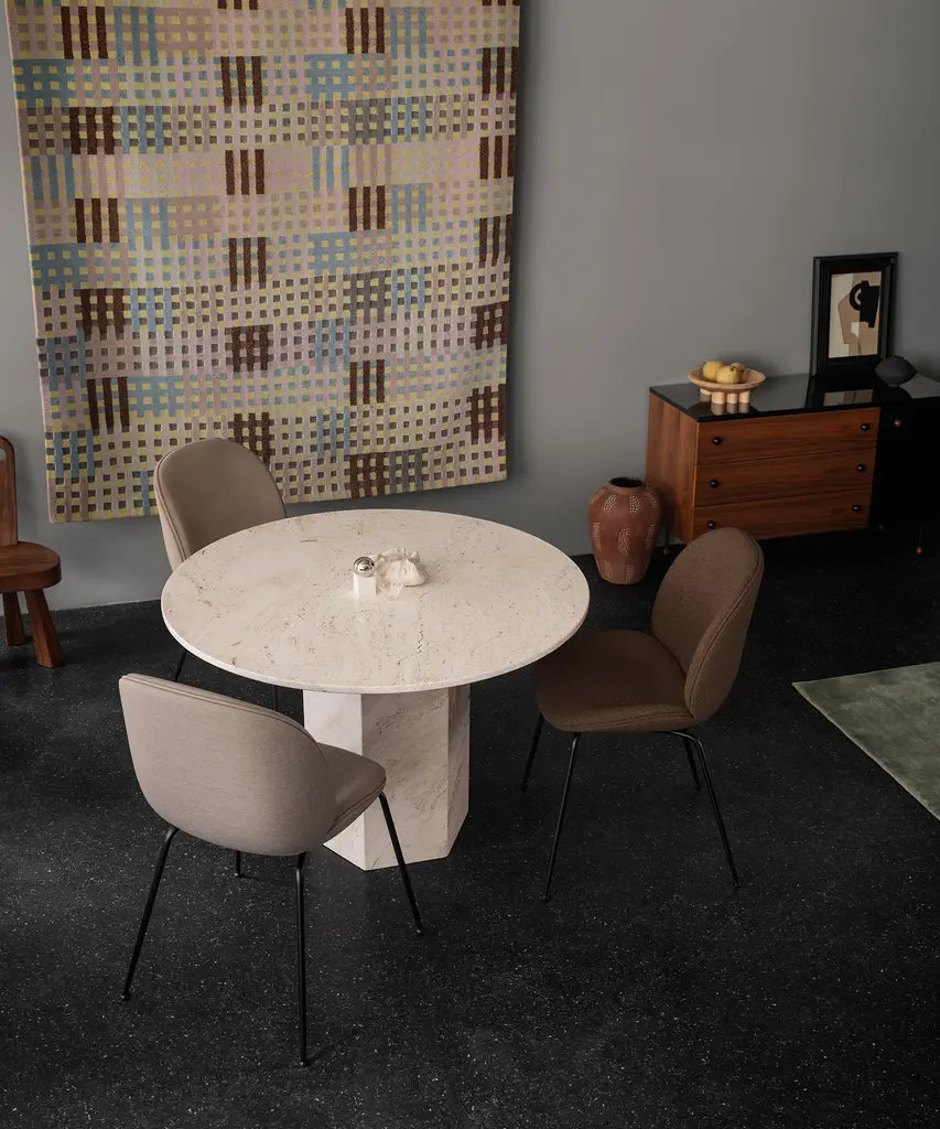 Designed by GamFratesi, the Epic Table is a sculptural piece of furniture inspired by Greek columns and Roman architecture. Made in Italy from travertine stone, the monolithic form emphasizes the materiality of the stone, the natural beauty of its veins, and the vibrant texture of its unique patina. A color palette of Neutral White or Burnt Red enables the impact of the piece to be dialed up or down to suit the interior space. Produced by Danish design publisher, Gubi.