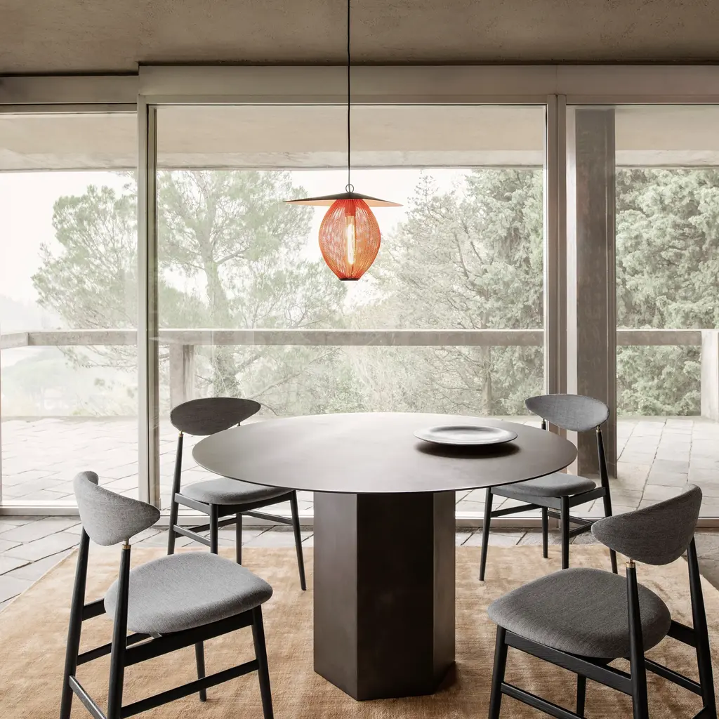 In a commanding steel version, designers GamFratesi reinterpret Epic, their sculptural dining table inspired by ancient Greek and Roman architecture. Named after the Homeric poems of ancient times, Gubi’s monolithic piece melds the beautifully plain geometry of the circular atop a hexagonal base. The impressively monochromatic table comes in a choice of black, misty grey or an earthy red finish that impart a suitably monumental touch to spaces both private and public.