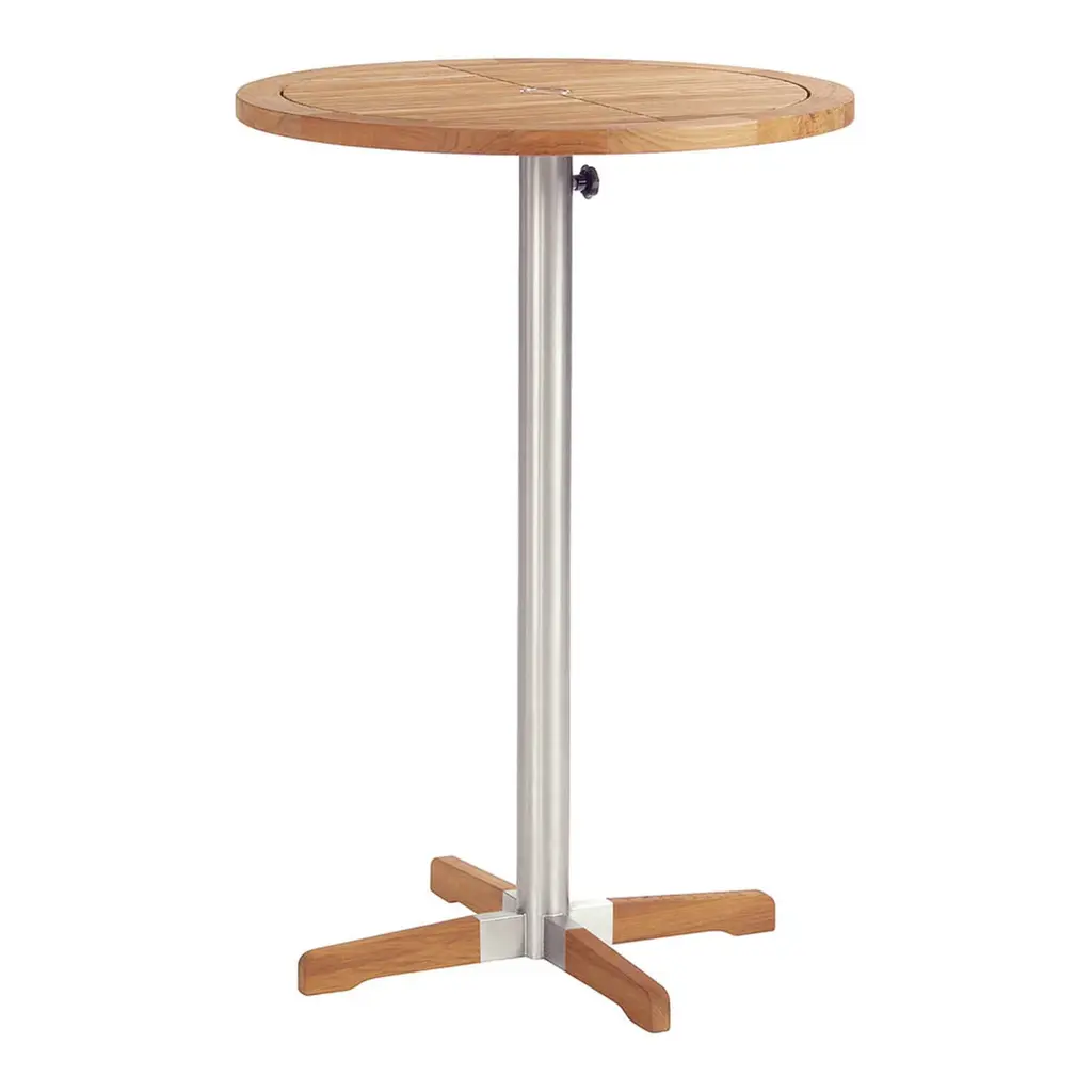 The stylish and modern Equinox Circular Pedestal High Dining Table, crafted with premium-grade steel and teak by Barlow Tyrie. This solid and sturdy high dining table has been designed to perfectly balance warm and cool tones, adding a unique transitional style to your patio, backyard or poolside space. as well as a contemporary feel that will take your outdoor area up a notch. Highlights