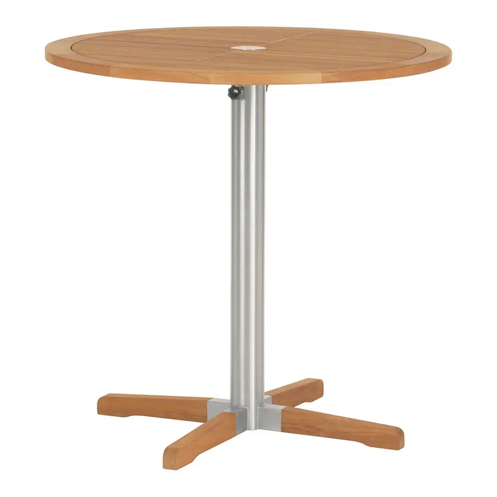 The stylish and modern Equinox Circular Pedestal High Dining Table, crafted with premium-grade steel and teak by Barlow Tyrie. This solid and sturdy high dining table has been designed to perfectly balance warm and cool tones, adding a unique transitional style to your patio, backyard or poolside space. as well as a contemporary feel that will take your outdoor area up a notch. Highlights