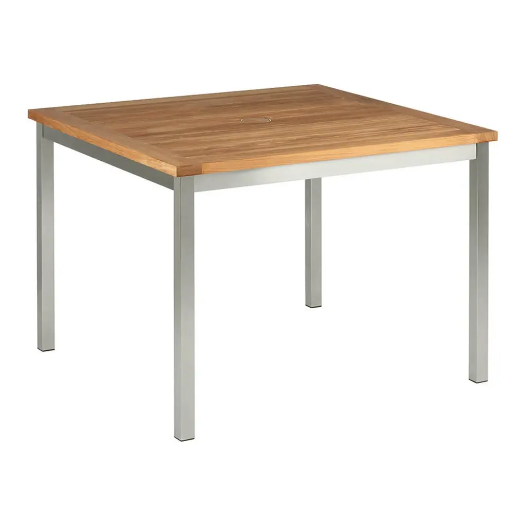 Introducing the Equinox Dining Table with Teak Top from Barlow Tyrie. This unique piece of outdoor furniture is made from the highest quality 316 marine grade stainless steel to provide you with long-lasting durability and strength, resistant to corrosion even in the harshest coastal areas. The beautiful cut-out design in the center creates an aesthetically pleasing focal point and also frames a parasol perfectly, allowing you to customize your outdoor dining space with ease.Highlights