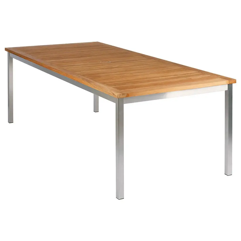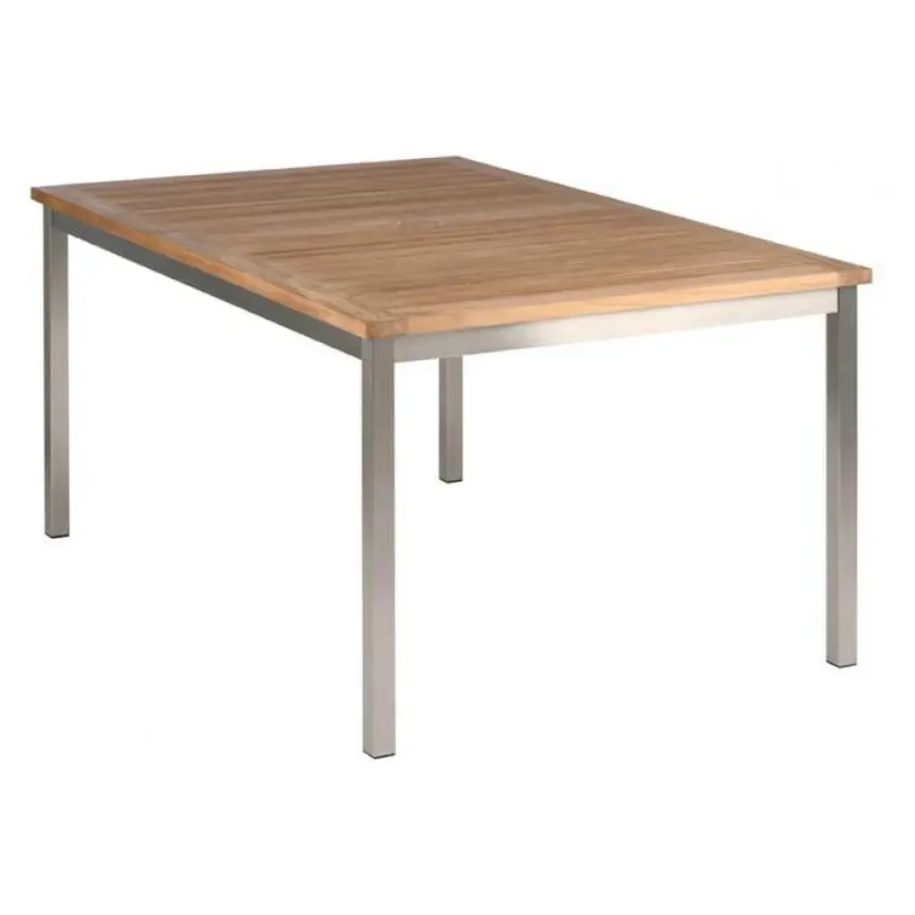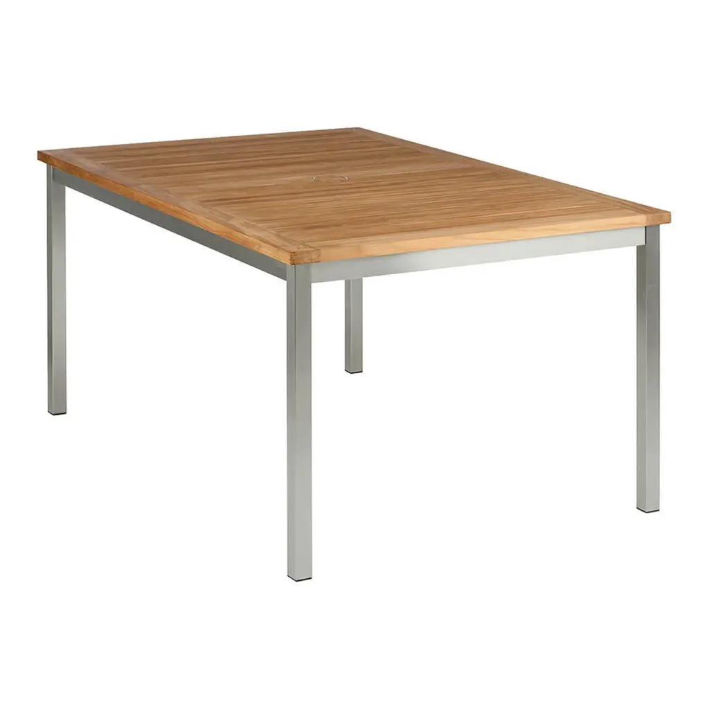 The Equinox Square Outdoor Dining Table with Teak Top from Barlow Tyrie beautifully merges refined design and everyday functionality, making it an excellent choice for al fresco dining. Expertly crafted with durable stainless steel and a rich teak top, this table is well-suited for outdoor environments such as patios, balconies, and terraces. The square shape offers a balanced, space-efficient footprint—perfect for both intimate meals and casual gatherings. With its transitional design that blends traditional charm and modern appeal, and a central umbrella hole for added sun protection, the Equinox Square Dining Table is ideal for those who value both style and comfort in their outdoor entertaining spaces.