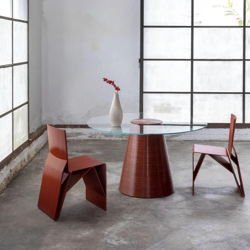 Erice is a round dining table merging craftsmanship and digital innovation. Its 3D-printed biodegradable plastic trunk supports a transparent glass top, showcasing the structure. With Mediterranean elegance, it invites conviviality indoors or outdoors. It reflects innovative design, digital tech, and craftsmanship, offering customizable, environmentally conscious furniture. Erice combines style and functionality. Please, ask the Concierge service for further information.