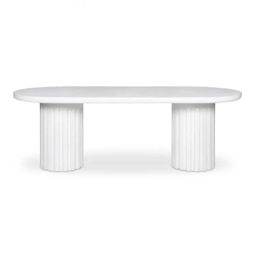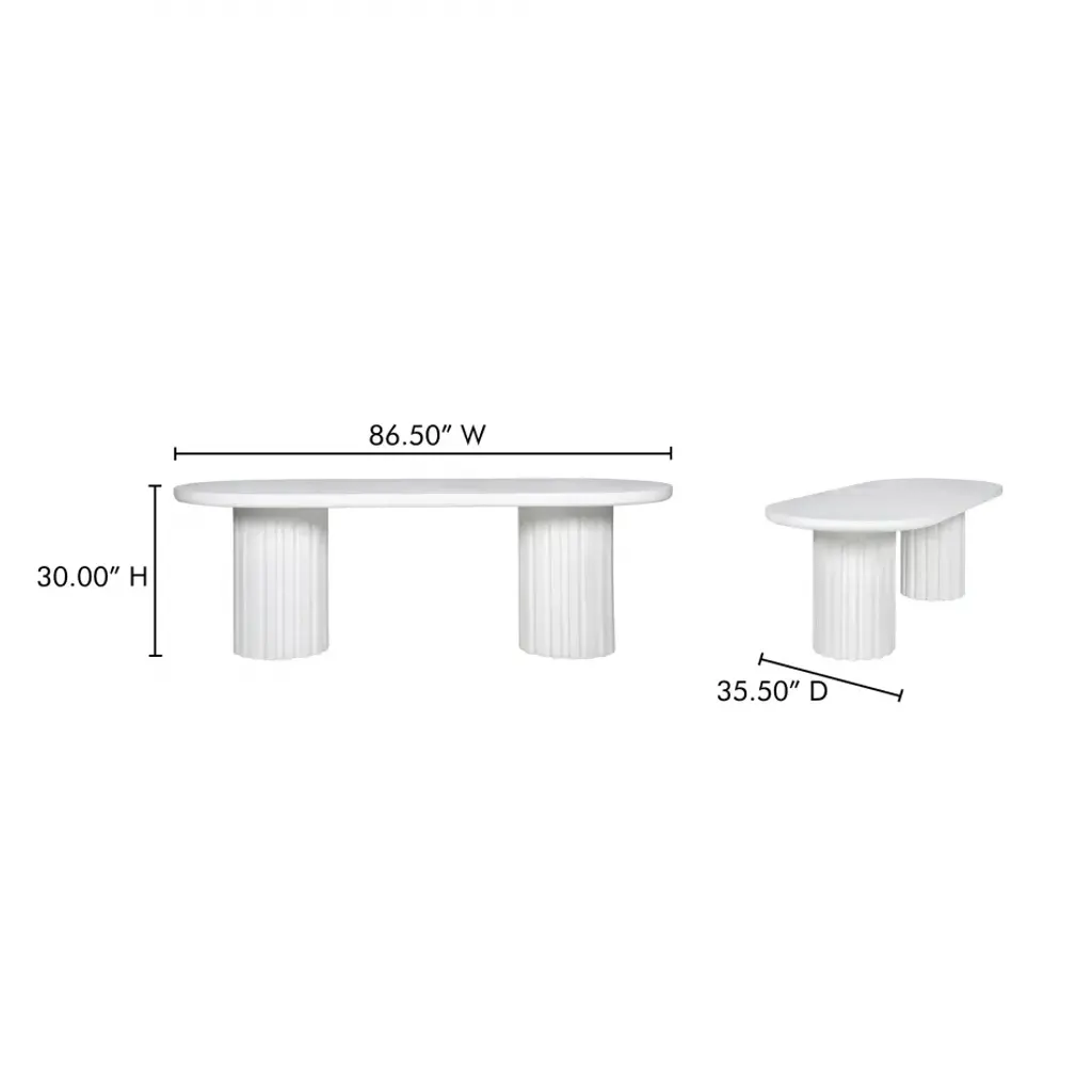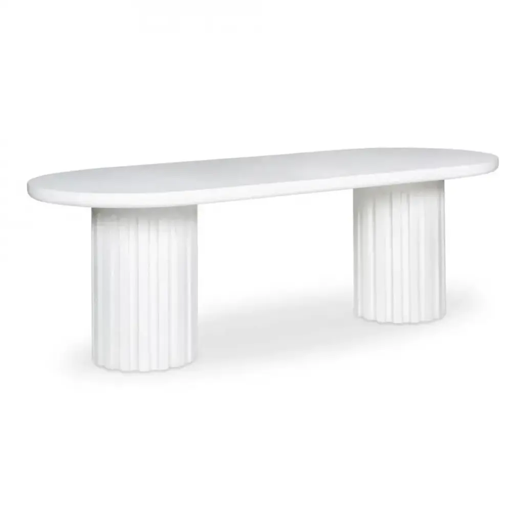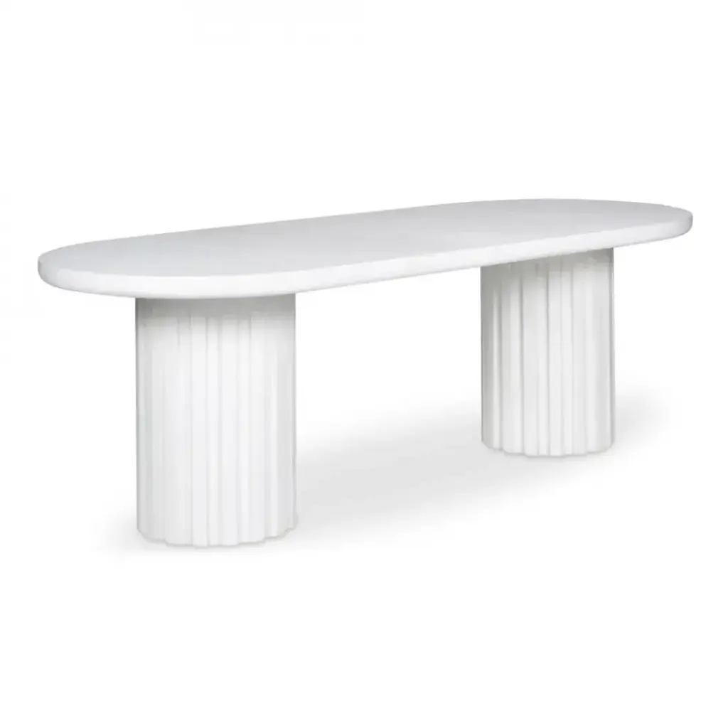 A striking interplay of shapes, the Eris outdoor dining table embraces round forms with a column-like fluted side. The rough concrete texture adds depth and complexity to an otherwise simplistic form, making it a statement piece suitable indoors and out. Exceptionally composed of Glass Fiber Reinforced Concrete (a fusion of cement, glass fiber, and Styrofoam), this table offers unique aesthetics while maintaining its beauty.
