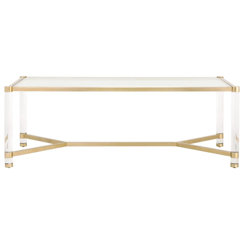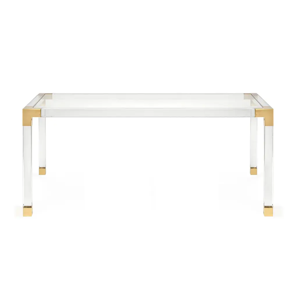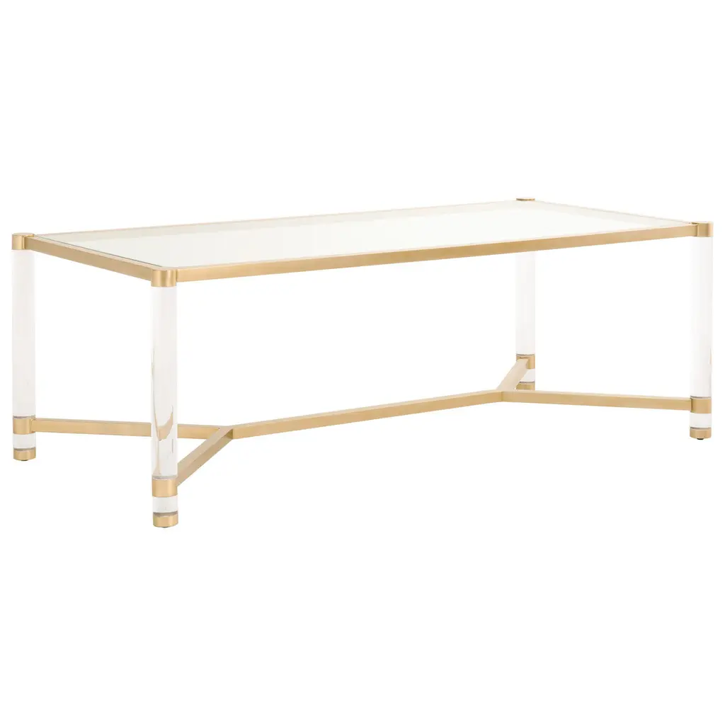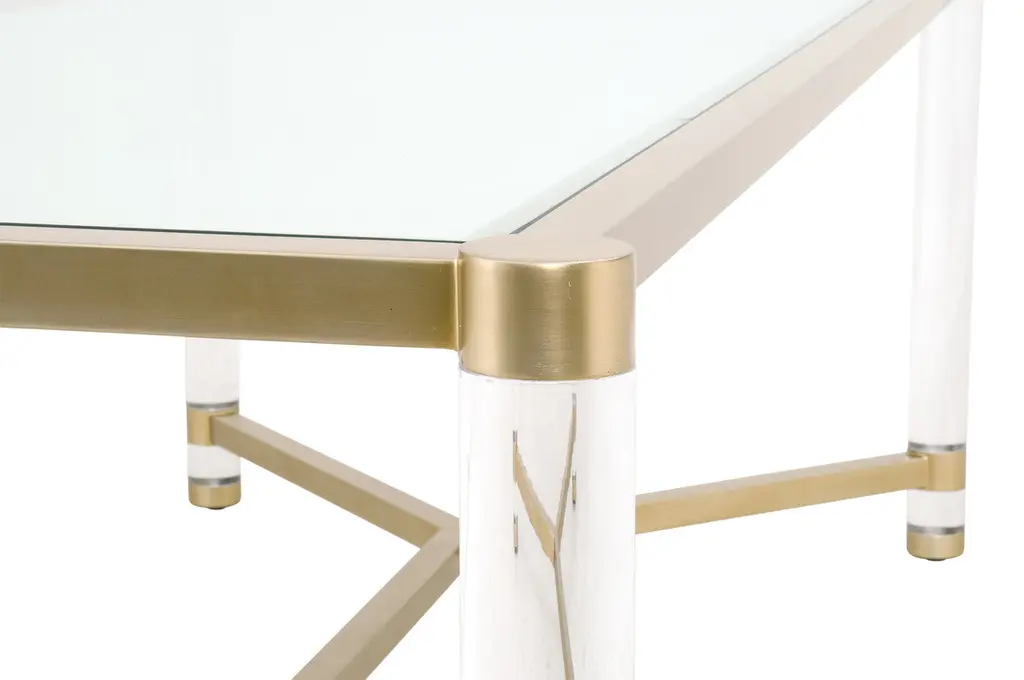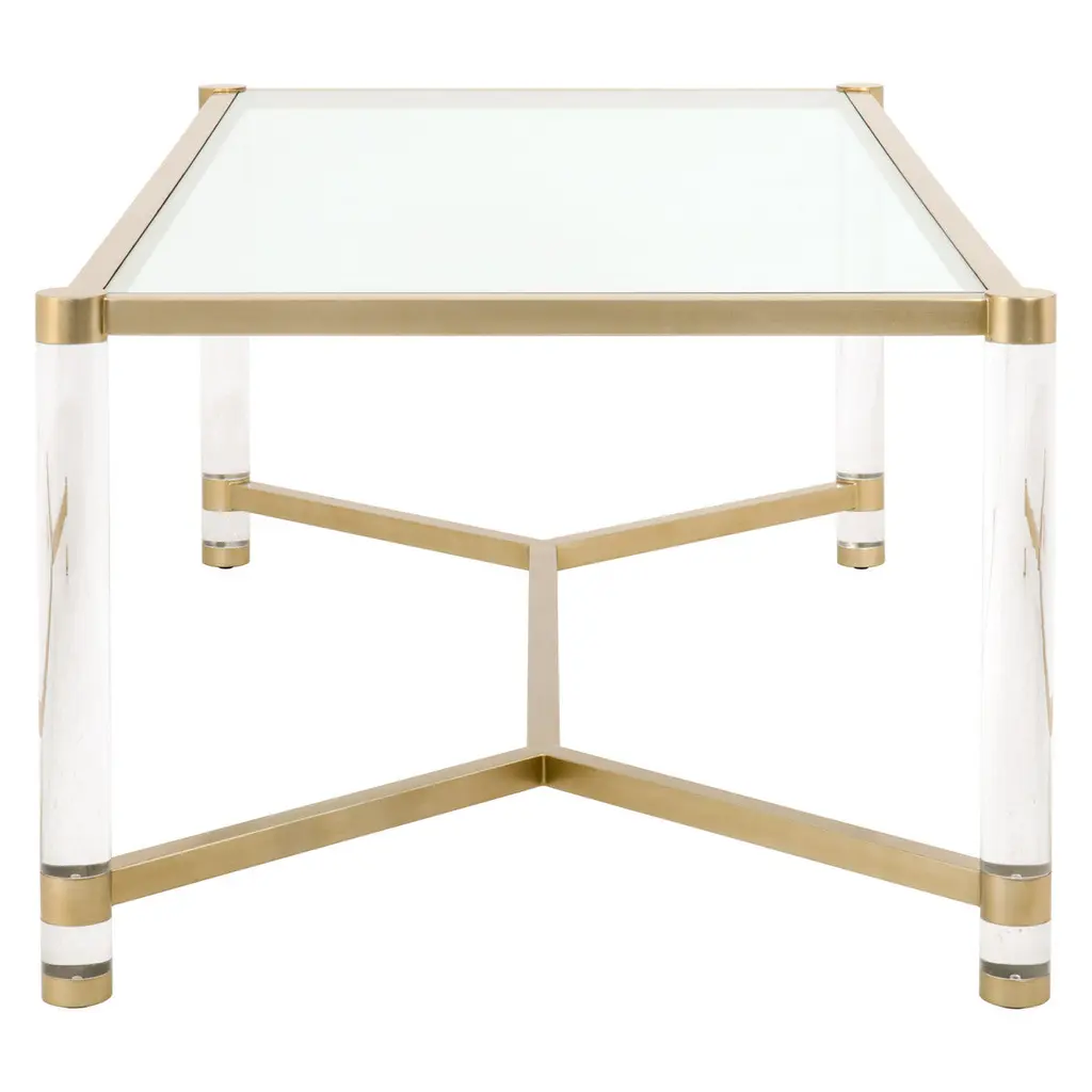 This modern glass dining table will really open your dining space. The glass top and acrylic clear legs help with giving the illusion that your space is larger than it is. The table is constructed with tempered glass and a brushed brass metal frame. The stretcher base is also made of brushed brass metal and adds suppor