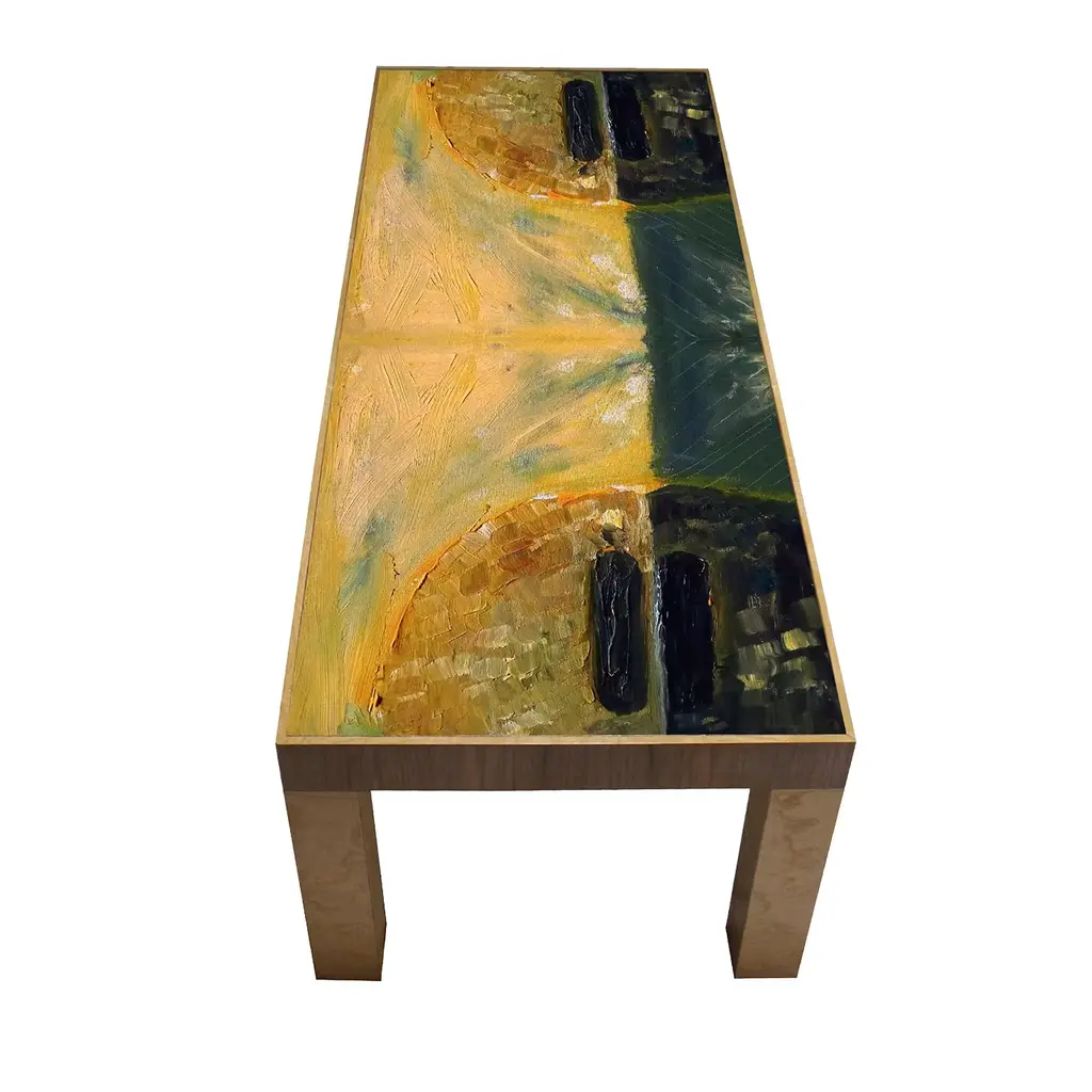 British artist Richard Woods is renowned for his work with garish and repetitious motifs. He has applied these to facades, floors and walls across the world in commissioned work and gallery installations. These ‘logos’ are often abstractions and interpretations of domestic pattern, the woodblock print being a particularly recognizable signature print. Designer Sebastian Wrong teamed up with Woods for Established & Sons’ programme of collaborations where individuals from two creative fields work together. Woods’ block printed motifs were applied to Wrong’s utilitarian cabinets. These tables are reminiscent of 1950s furniture – a fitting vehicle because much of Woods’ work is based on a nostalgia for midcentury domestic interiors.