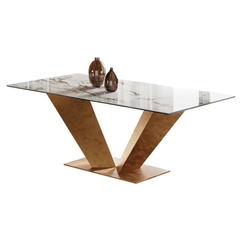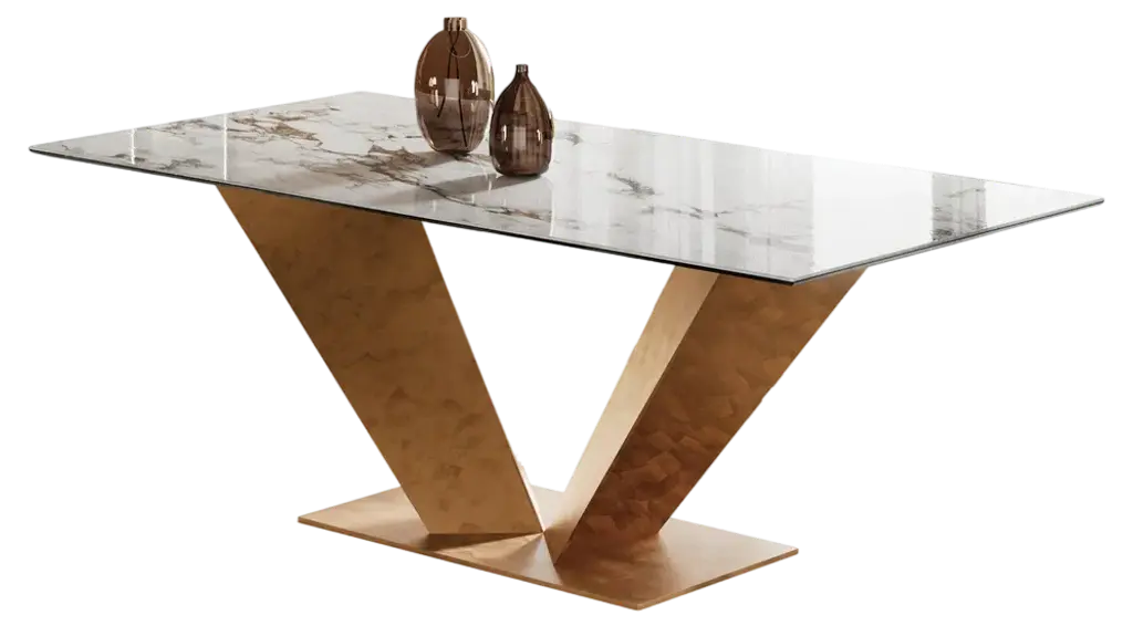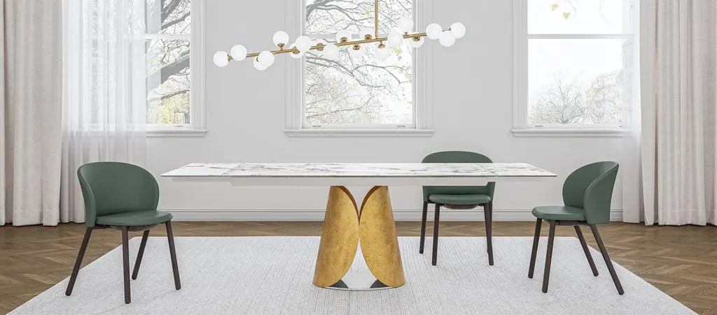 Estia Allungabile Dining Table by Chinellato DesignDimensions: W 200 x D 100 x H 81 cmExtendable: + 40 / + 40 cmMaterials:Top: Glossy Ceramic Capraia, Extra Clear Tempered Glass.Base: Black Patinated Gold.Rectangular dining table available in two sizes and one combination of base and Top finishes. The base, crafted from worked and shaped steel, is finished in Black Patinated Gold. The Top is made of Glossy Capraia Ceramic with an Extra Clear Tempered Glass Under Top. The extension support consists of an Aluminum track, Bronzino 25 tint, allowing extensions to be stored underneath the main table surface.In this table, graceful curves take center stage, exuding an enveloping softness that harks back to the essence of the deity from which it derives its name: Estia, the goddess of the hearth and family. Like the warmth of a domestic fire that imparts a sense of protection and hospitality, the graceful curves defining it captivate the gaze and evoke the flickering of flames in the finishes of the chromed base, a mirror that reflects the regal beauty of the goddess, lending luminosity to the entire composition.Chinellato has been operating in furnishing since 1969. In that year Paola Chinellato embarked on the path of frame finishing using the leaf decoration technique, typical of the Venetian artisan tradition. Over the years, Paola and her son Massimo have developed interior finishing solutions. Their craftsmanship skills thus became a family tradition.Since 2005 Chinellato has focused on the study of new finishing techniques on different materials with innovations that allow their use for new design requirements. In this path the finishing of the furniture object becomes a fundamental moment in the creation of design value.