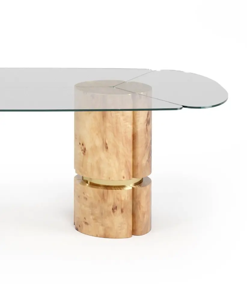 Euphoria Dining Table by Memoir EssenceDimensions: D 120 x W 260 x H 76 cm.Materials: Polished brass, lacquer and glass.Also available in brushed brass. Please contact us. Dynamic, and classy, this is a new version for Euphoria Collection. Fully veneered in poplar root, with polished brass details this rectangular dining table is finished in high gloss varnish. The top of the table is in transparent glass. The organic shape of this piece makes these dining table a must-have to any exquisite project.In order to celebrate this season Memoir presents you the magic of the winter in this lovely living room, where the soft colors of our SEDUIRE Sofas and SECRET Cabinet are pontuacted by a deep red color in the NEW Center Table Set EUPHORIA. In the dining room, the poplar root wood veneer in our NEW Dining Table EUPHORIA and the soft colors of Memoir pieces are connecting both areas. A timeless palette scheme transportation us to a winter wonderland interior.
