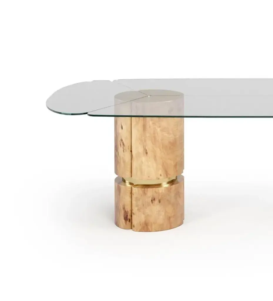 Euphoria dining table by memoir essence dimensions: d 120 x w 260 x h 76 cm. Materials: polished brass, lacquer and glass. Also available in brushed brass. Please contact us. Dynamic, and classy, this is a new version for euphoria collection. Fully veneered in poplar root, with polished brass details this rectangular dining table is finished in high gloss varnish. The top of the table is in transparent glass. The organic shape of this piece makes these dining table a must-have to any exquisite project. In order to celebrate this season memoir presents you the magic of the winter in this lovely living room, where the soft colors of our seduire sofas and secret cabinet are pontuacted by a deep red color in the new center table set euphoria. In the dining room, the poplar root wood veneer in our new dining table euphoria and the soft colors of memoir pieces are connecting both areas. A timeless palette scheme transportation us to a winter wonderland interior.