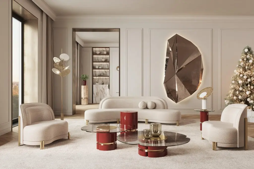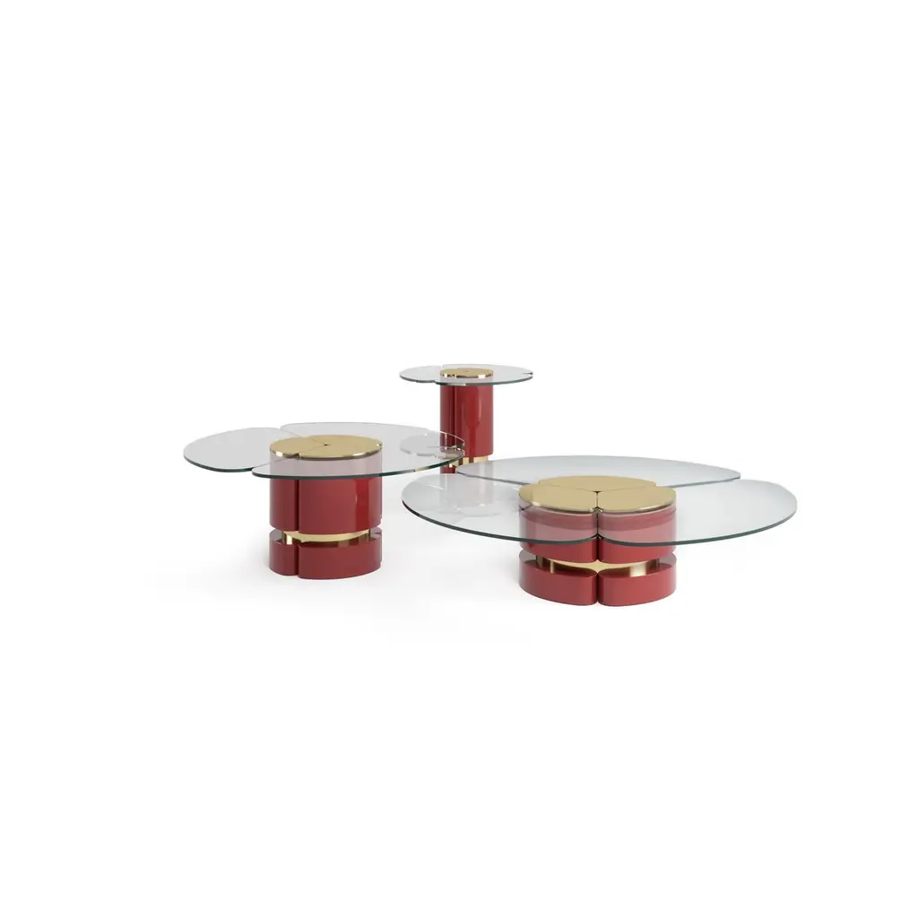 Euphoria Small Center Table by Memoir EssenceDimensions: D 50 x W 50 x H 50 cm.Materials: Polished brass, lacquer and glass.Available in different sizes. Please contact us.Memoir presents the new center table set Euphoria. Dynamic, and classy, this is a new version for Euphoria Collection. In a rich and deep red lacquered base, with polished brass details this piece is finished in high gloss varnish. The top of the tables is in transparent glass. A extraordinary set that can be used combined or separated to enhance any interior.In order to celebrate this season Memoir presents you the magic of the winter in this lovely living room, where the soft colors of our SEDUIRE Sofas and SECRET Cabinet are pontuacted by a deep red color in the NEW Center Table Set EUPHORIA. In the dining room, the poplar root wood veneer in our NEW Dining Table EUPHORIA and the soft colors of Memoir pieces are connecting both areas. A timeless palette scheme transportation us to a winter wonderland interior.