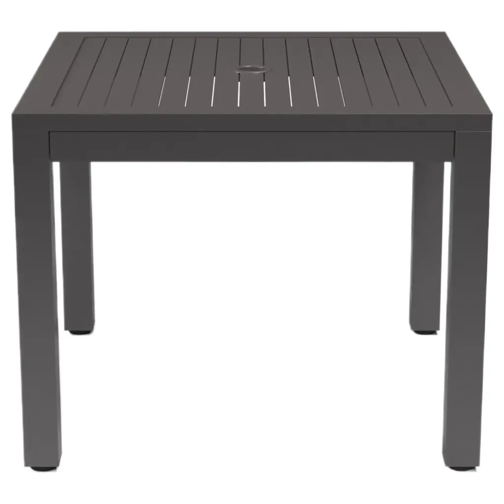 The Evandor Collection offers ease of outdoor dining and entertainment with its low maintenance sling and aluminum frame. The Evandor DiningTable is crafted with a scratch-resistant powder-coated aluminum frame and features a slate table top and umbrella hole. Fully welded, the frame is designed to withstand the elements with weather-resistant, tear-resistant textilene. Non-marking plastic glides ensure protection for your surfaces. This collection is built with commercial quality construction and requires some assembly.
