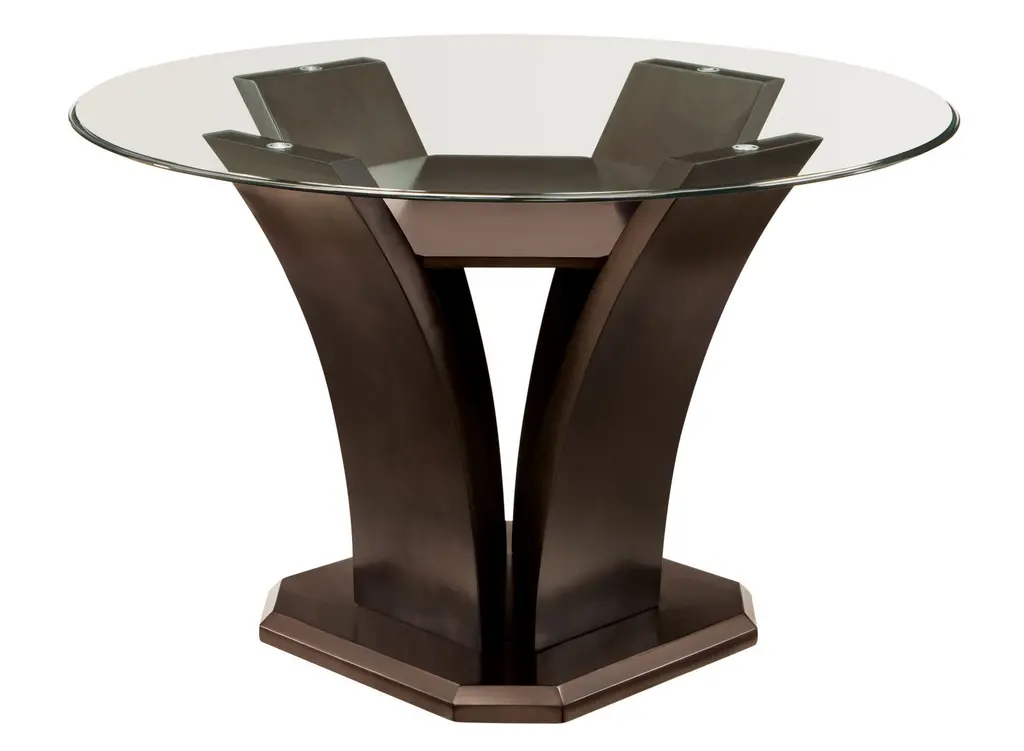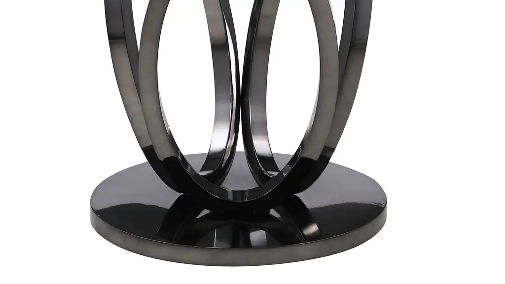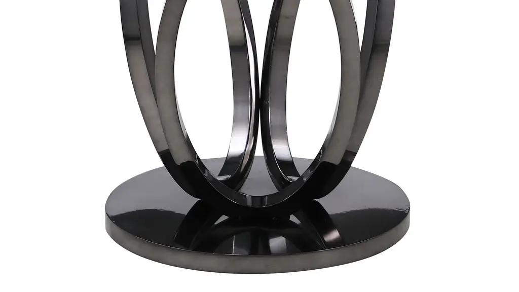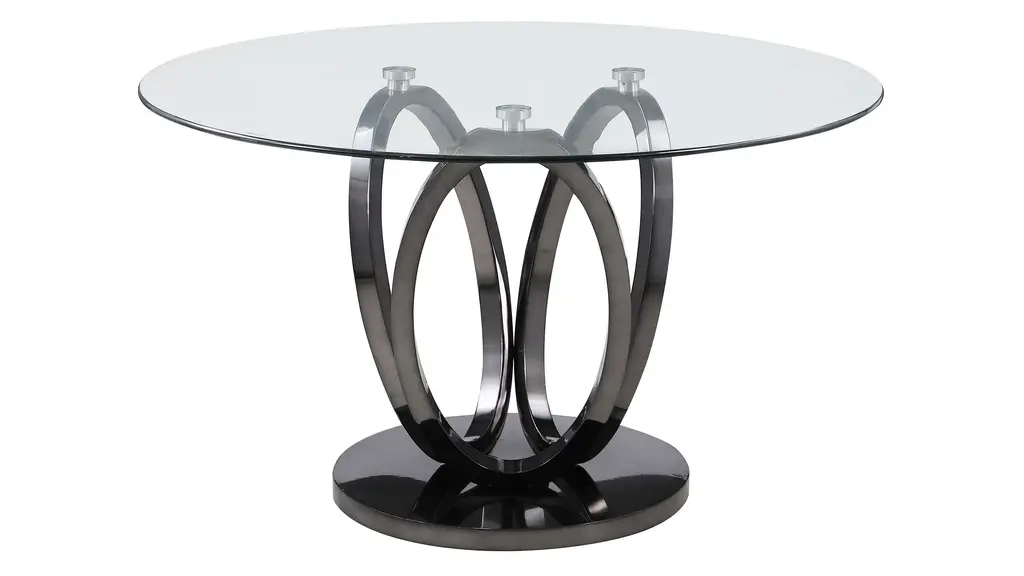 Evelyn Dining Table featuring a bold mirror-like three ring pedestal bases with a gorgeous glass top, this contemporary table offers an elegant black chrome finish.