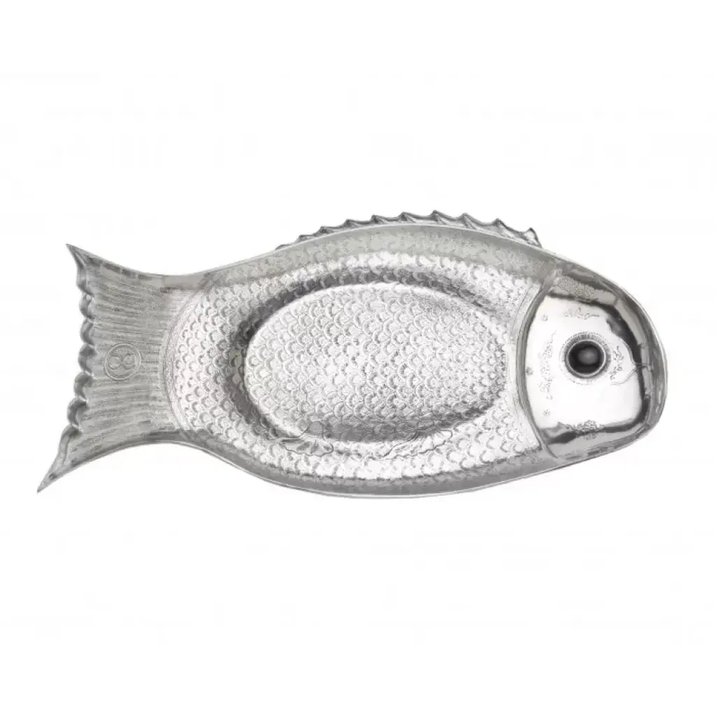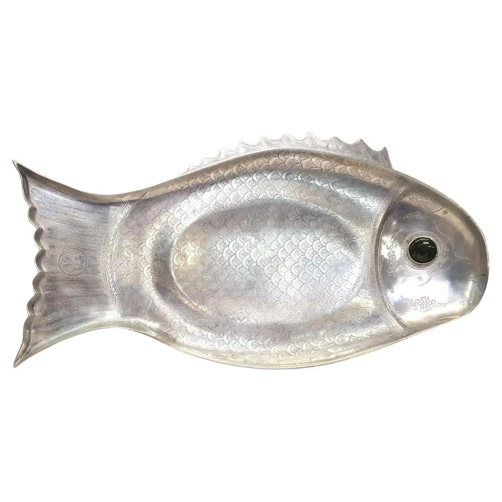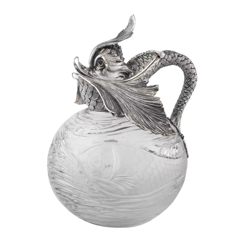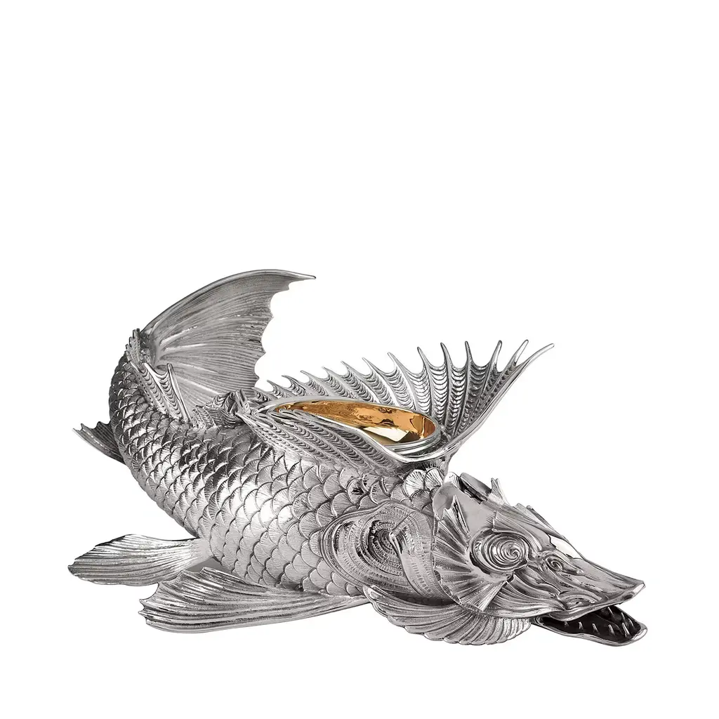 This sumptuous piece is entirely made in silver and will enrich a dining table or entryway with its superb craftsmanship and sophisticated details. This centerpiece is specifically designed to hold a caviar jar, which can be stored in the top pocket internally finished in gold. All around it, a vividly rendered sturgeon is depicted in all its details with scales, fins, and teeth all masterfully executed. This piece of functional decor is a true work of art.