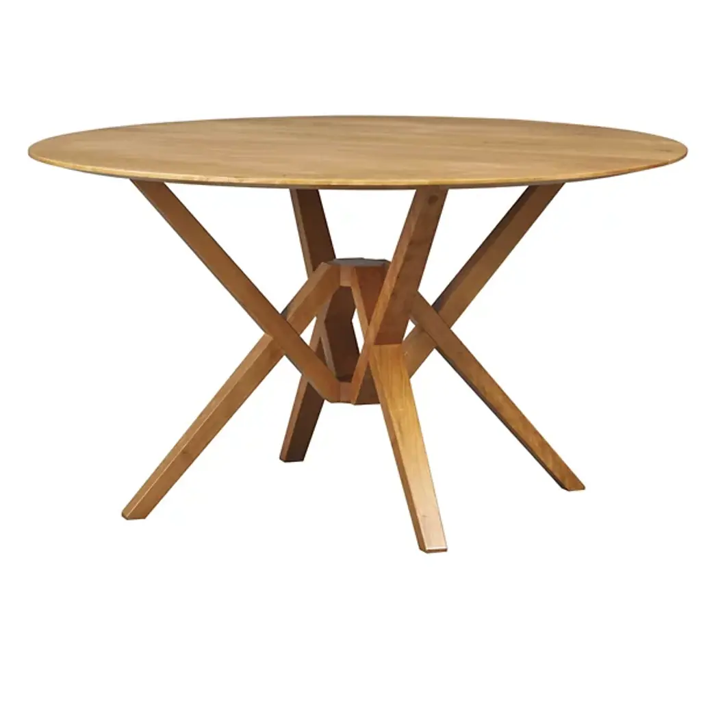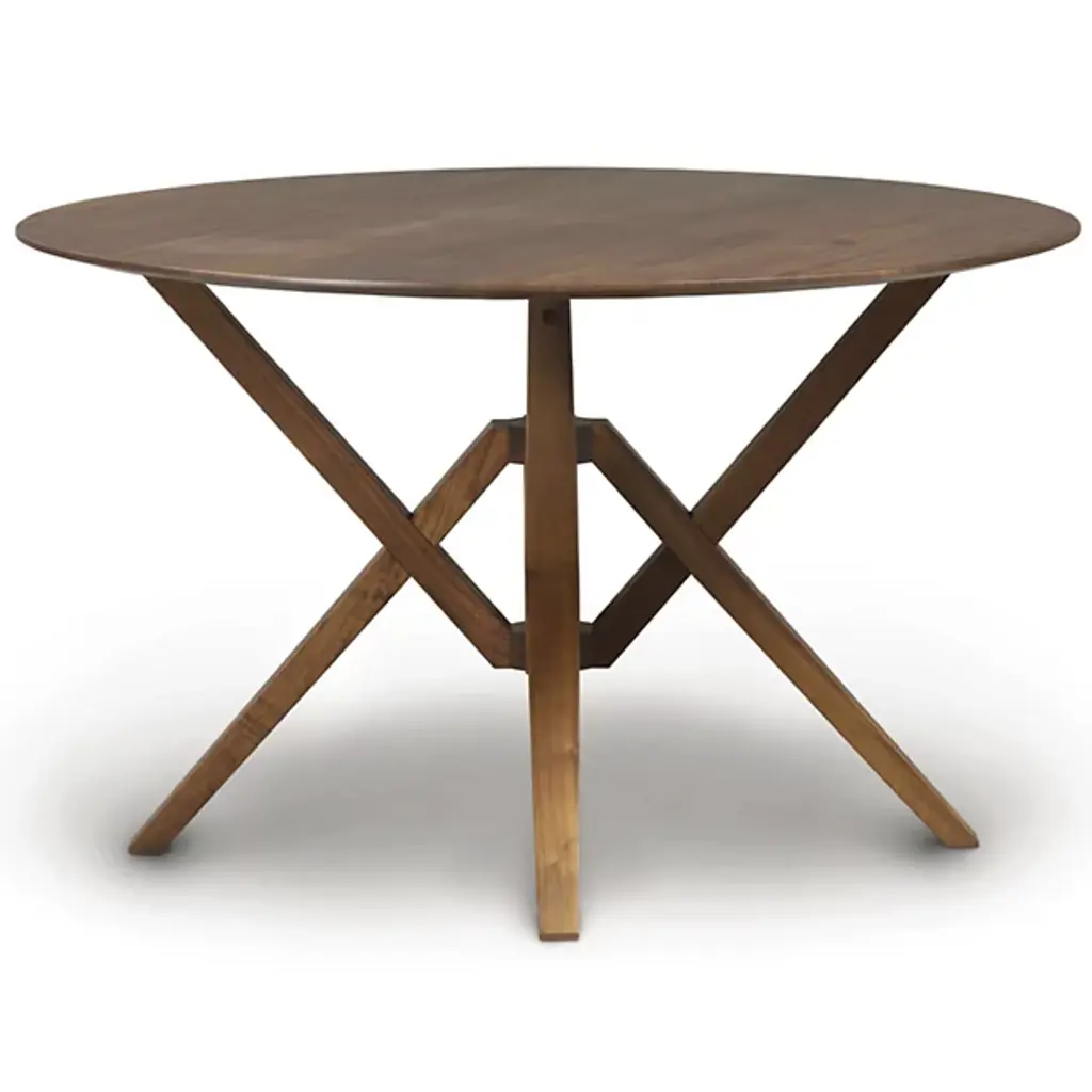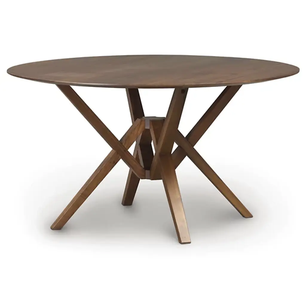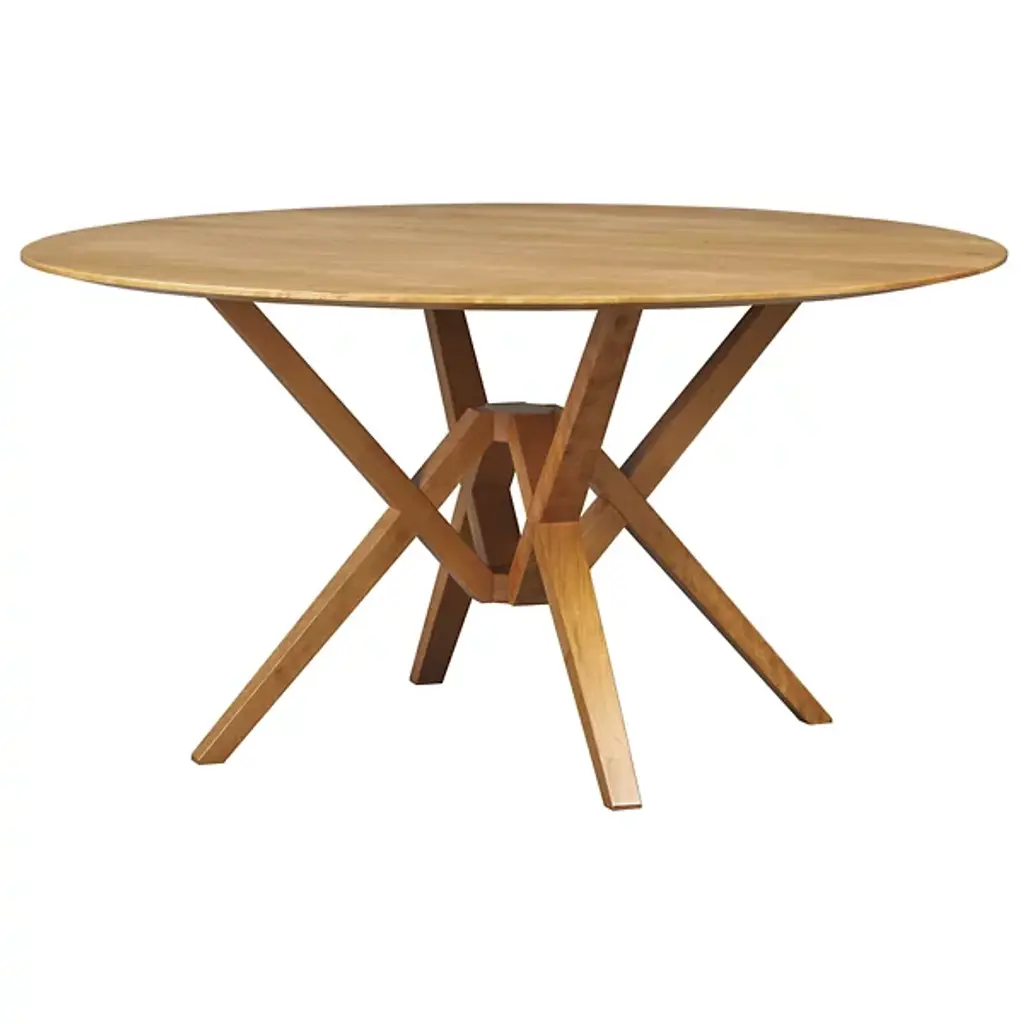 A classic look with unexpected twists. The upper surface of the Copeland Furniture Exeter Round Dining Table presents a clean, circular tabletop, made from beautiful natural Wood and ideally sized for your dining room or breakfast nook. Beneath that surface, a complex network of angled legs creates exquisite geometry and an exceptionally detailed design. Straying away from the traditional straight-legged approach, the intersecting Wood beams of the base give the table incredible depth and stability. The unique structure heightens the table's style while also leaving extra room for legs and feet when you have family or friends gathered around for a meal.